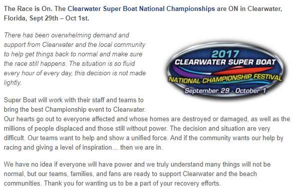 The organizers, teams, families, and all those involved in the Clearwater Super Boat National Championships are gearing up for this year’s races with the focus of delivering the best races the area has ever seen and supporting all those affected by Hurricane Irma.