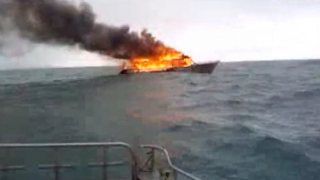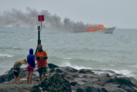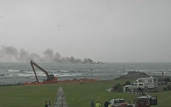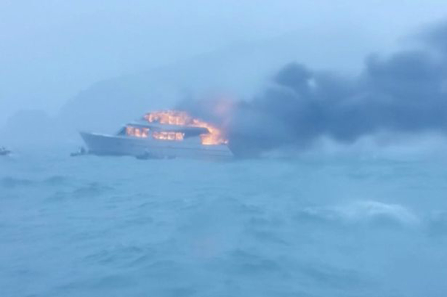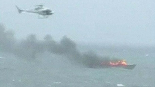 This morning off the coast of New Zealand, the tourist vessel PeeJay’s entire compliment of 60 people including 53 passengers and 7 crew were forced overboard due to a raging on-board fire. The fire spread from the front of the ship and then after about ten minutes the cabin burst into flames and the fire had engulfed the entire craft. As the fire broke out a little over half a mile from the shore, other ships and authorities sped to the scene to provide assistance to everyone jumping ship as the Captain kept up the mayday call.
