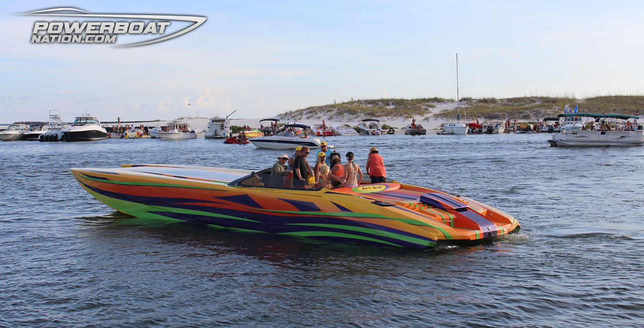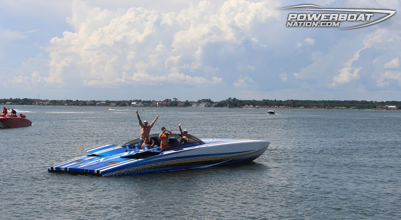 The past three or maybe four years, the Emerald Coast Poker Run brought us good times, but along with them rain and difficult weather. Well, this year we stuck to the plan and our persistence paid off – this outing was perfect, with a full roster of registered boats, great weather, and lots of water to run. Team Powerboat Nation was at the helm of one of two big SKATERS loaded with 1550 Sterlings and we had a supreme time.