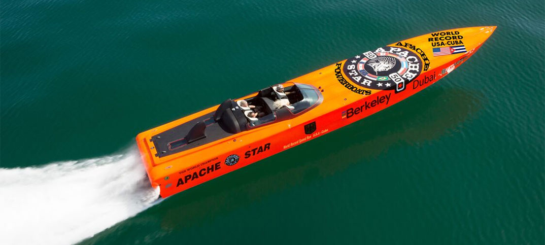 If you know anything about offshore racing history, you know the Apache name and what timeless quality it represents in the powerboating world. So you’ll be extra excited to know that the Apache Star, originally named the Apache Heritage, is back in action this Saturday to attempt to set a world speed record on a run from Key West, Florida to Havana, Cuba. The boat is notable as the first sit-down Deep-V made, not to mention already having broken several past records and winning world championships in ’92 and ’93.