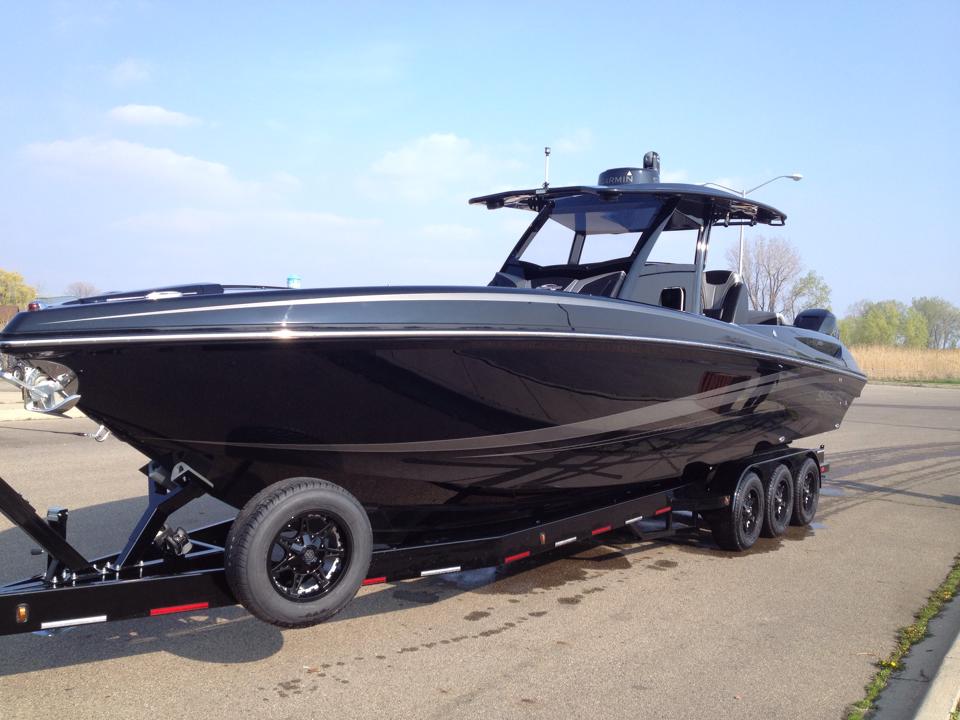 Adam and his crew continued to walk enjoying the show, Miami, and everything it had to offer, still not really even having the thought to buy a boat. Then Monday came and before flying back to cold Michigan, Adam thought the idea of being able to get out a few times a year every winter to go snowmobiling in the extreme cold should be balanced with going to Florida a few times a year every winter to go powerboating. So Adam made his way back over to the Sunsation Booth and ordered a brand new 34 CCX Sunsation Center Console Extreme, with triple 400R Outboards, and because all of his stuff is already black on black the boat would have to match.
