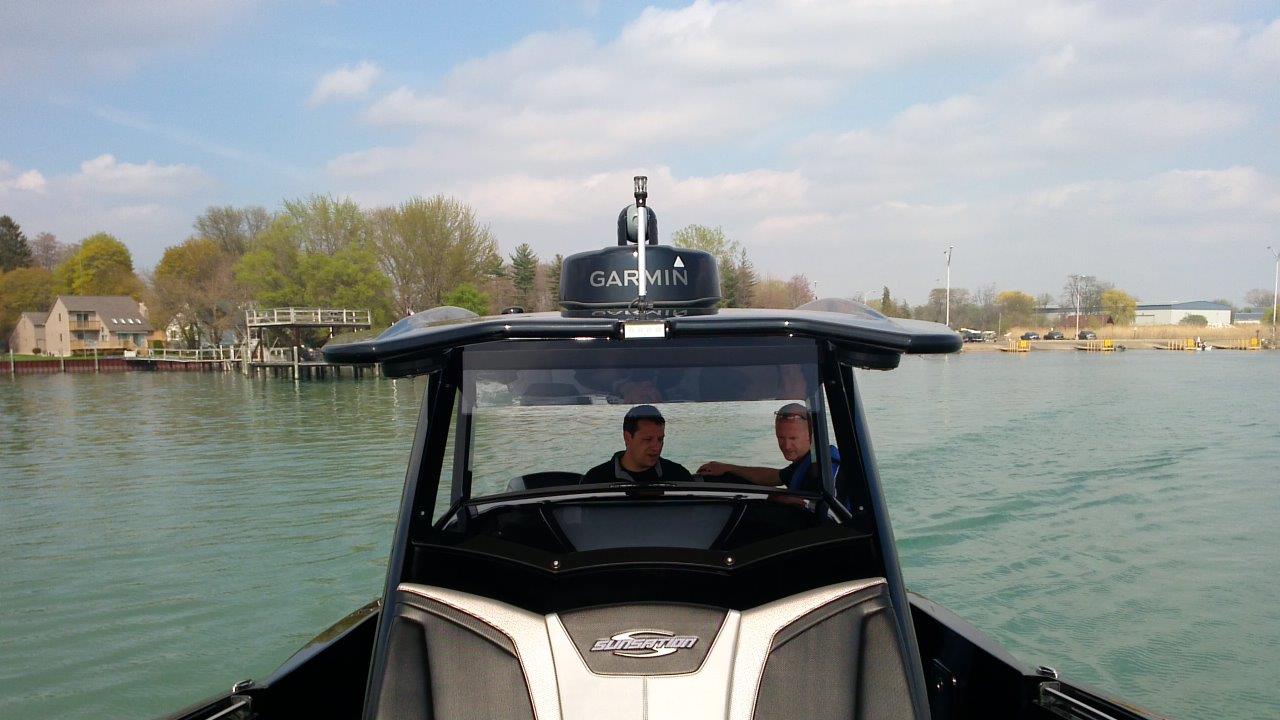 Getting to Miami and walking the show Adam had zero intention of buying a boat. He and his friends were enjoying the much warmer weather, having fun, and of course, looking at everything the Miami Boat Show had to offer. When they came upon the 34 CCX Sunsation demo boat in the water they related back to the knowledge of a great friend who has owned a Sunsation Sport Boat for over 20 years who enthusiastically tells us “the boat looks as good as new and has always performed above expectations, providing a couple of decades of great family fun and performance.” Then, when offered a invitation for a demo ride from one of the owners of Sunsation, Jared Morris, the now warm snowmobiling crowd all jumped aboard as Wayne Schaldenbrand ran them around Miami’s Biscayne Bay for a little joyride.