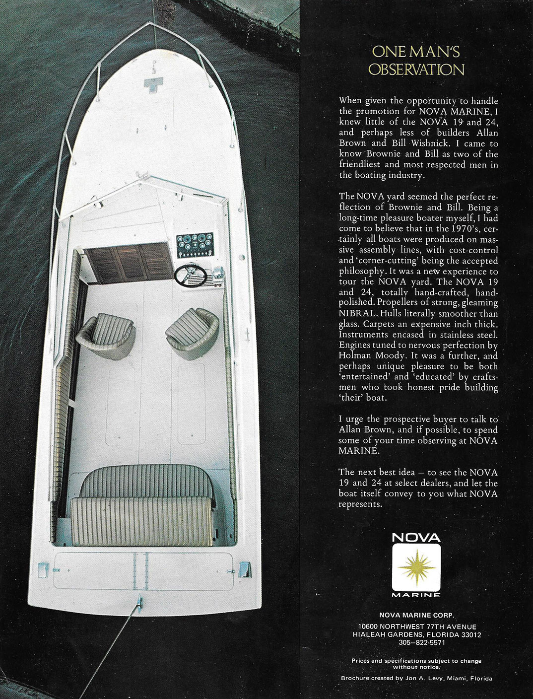 When the show opened, one of the first customers into the booth was an elderly gentleman who identified himself as Mr. Gottwald, Chairman of the Ethyl Corporation. He asked for me, and said that he had been referred by Ed Cantor (the bridge champion, not the comedian) to buy a Nova 24. He asked if he could get a quick ride, and I was pleased to tell him that we had the only demo at the show. It was powered by 351 Holman Moodys, and Crusader Vee drives. I instructed Pete to take him for a spin.