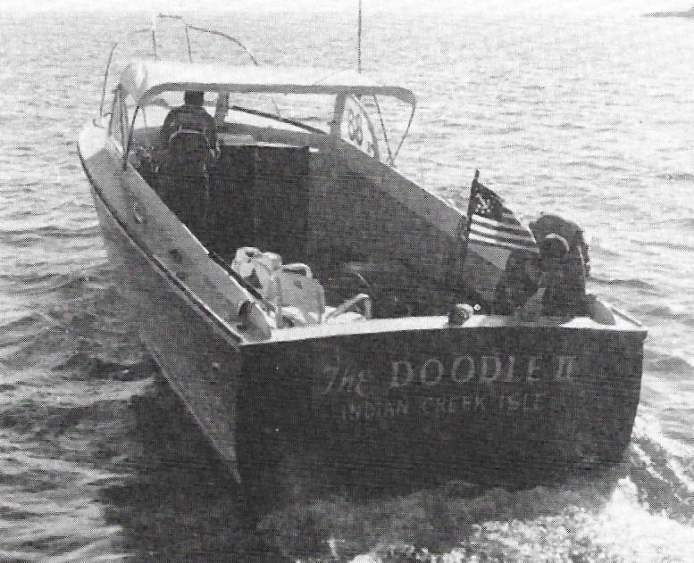 The course for the race was out Miami’s Government Cut (In order to give both spectators a good look at the fleet) to Cat Cay, in the Bahamas, where one must enter the harbor, Mon, to go through immigration and Customs. Fortunately, that was handled by having prepared documents wrapped around a rock, and hurled into each boat. Sam also had a 55 gallon drum of gasoline “hurled” into the Doodle II, in order to have enough fuel to make it Frazer’s Hog Cay, the next fuel stop.