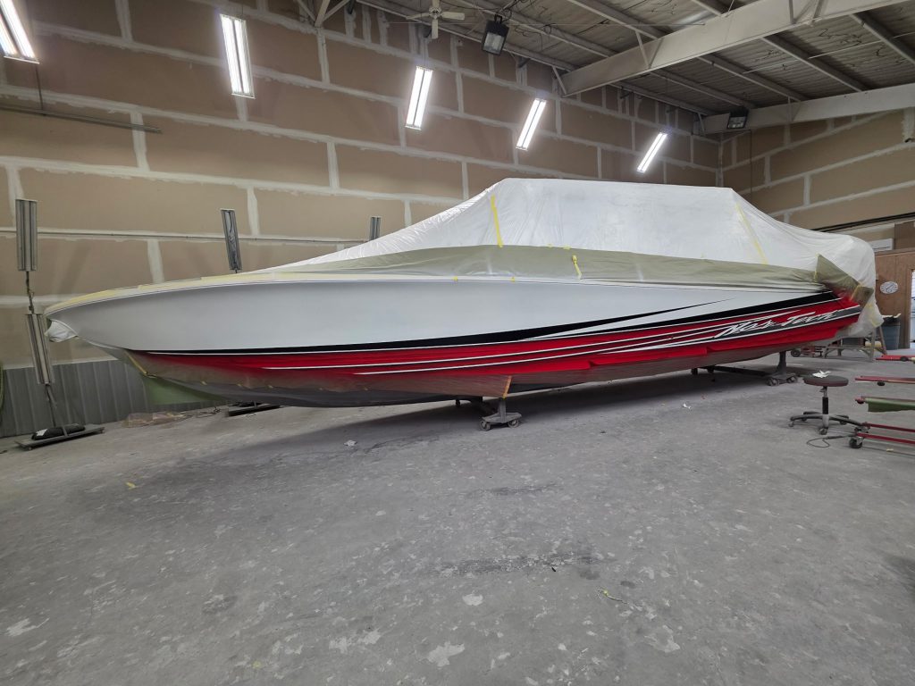 The first new Nor-Tech center console ordered by Unlimited Marine is in the paint booth at Stephen Miles Design.