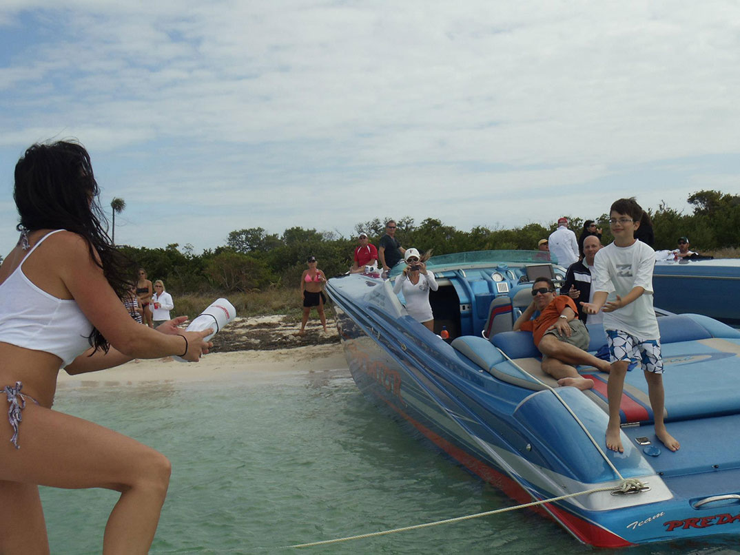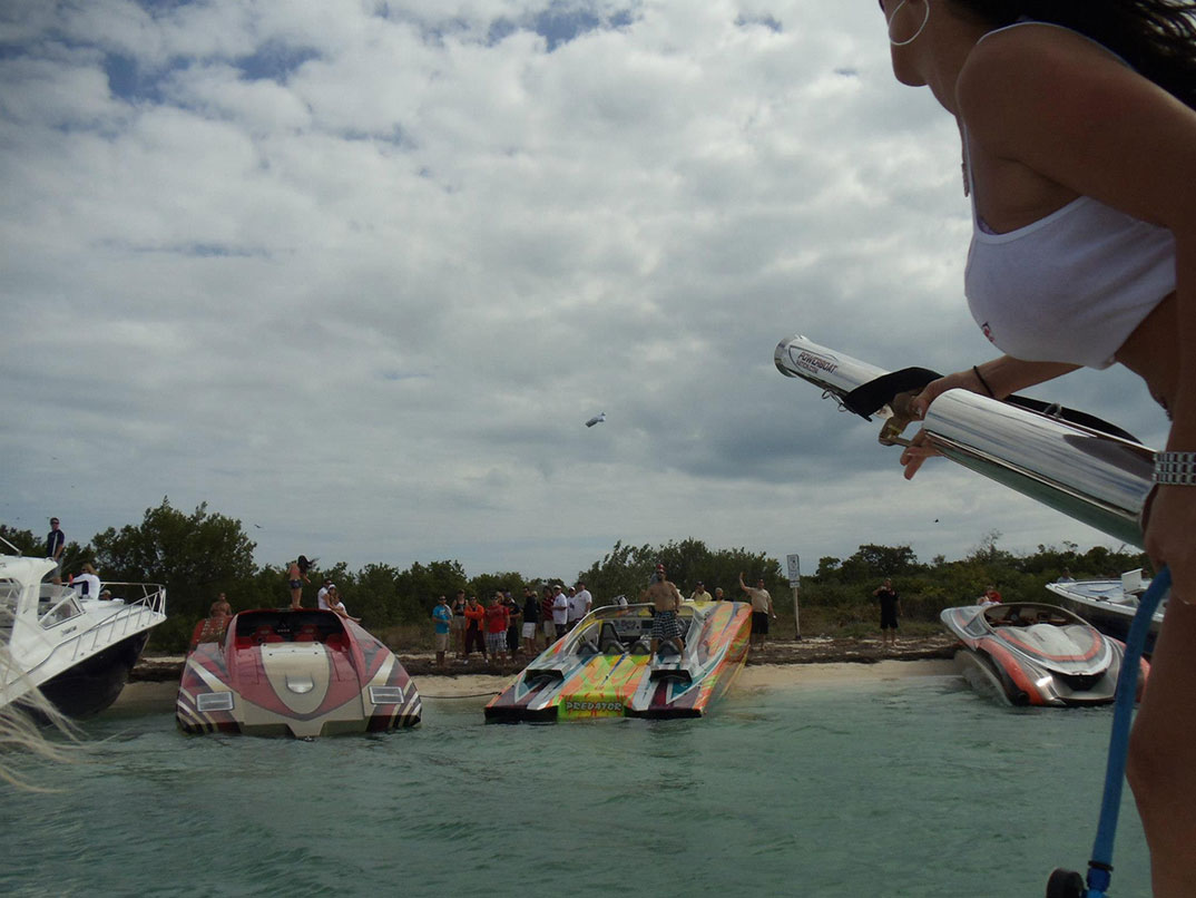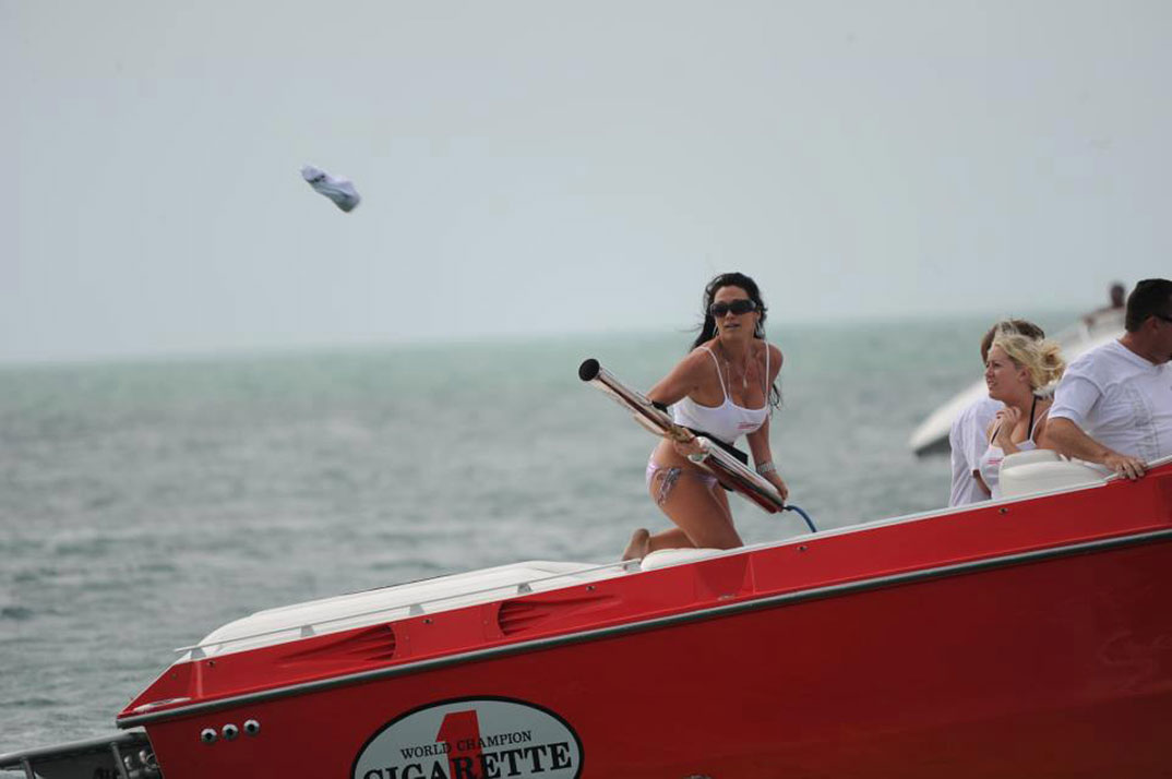 Not since the days of pirates or maybe some South Florida cocaine cowboys have cigarettes and cannons came together. But if you were fortunate enough to be in Key West this week then there’s a good chance you might have witnessed that cannon being fired from a sleek fast outlaw styled cigarette boat, or even caught one of the fabulous new Powerboat Nation inaugural t-shirts. Brad Schoenwald along with beautiful Amber Stephens were running from Key West to Boca Grande firing Powerboat Nation T-Shirts and koozie cups out of a one of a kind custom built highly polished T-Shirt cannon. The custom cannon had enough power to hit the top floor of the Ocean Key House and was a big crowd favorite. This is just one small example of how Powerboat Nation is giving back to the boating community.