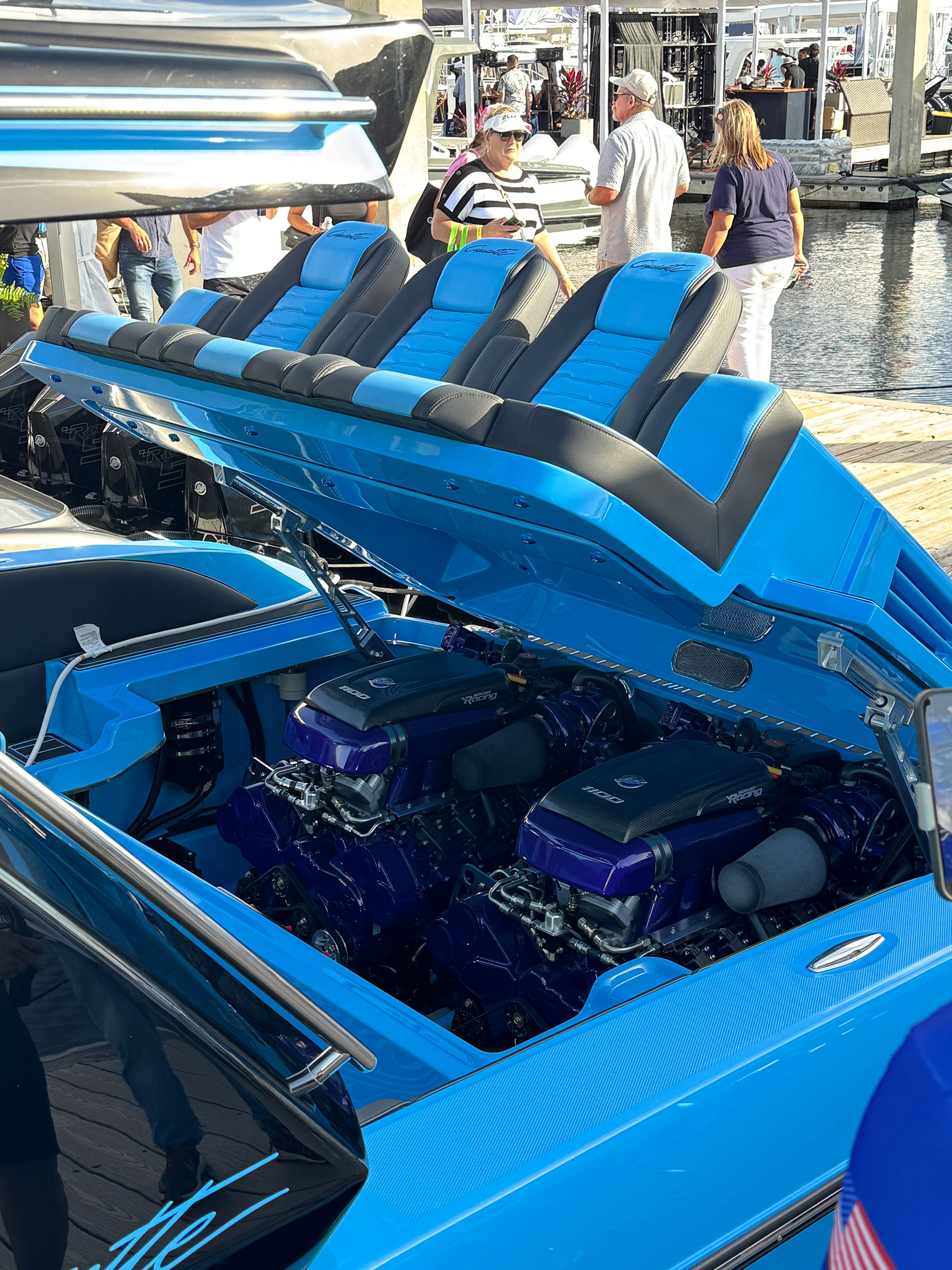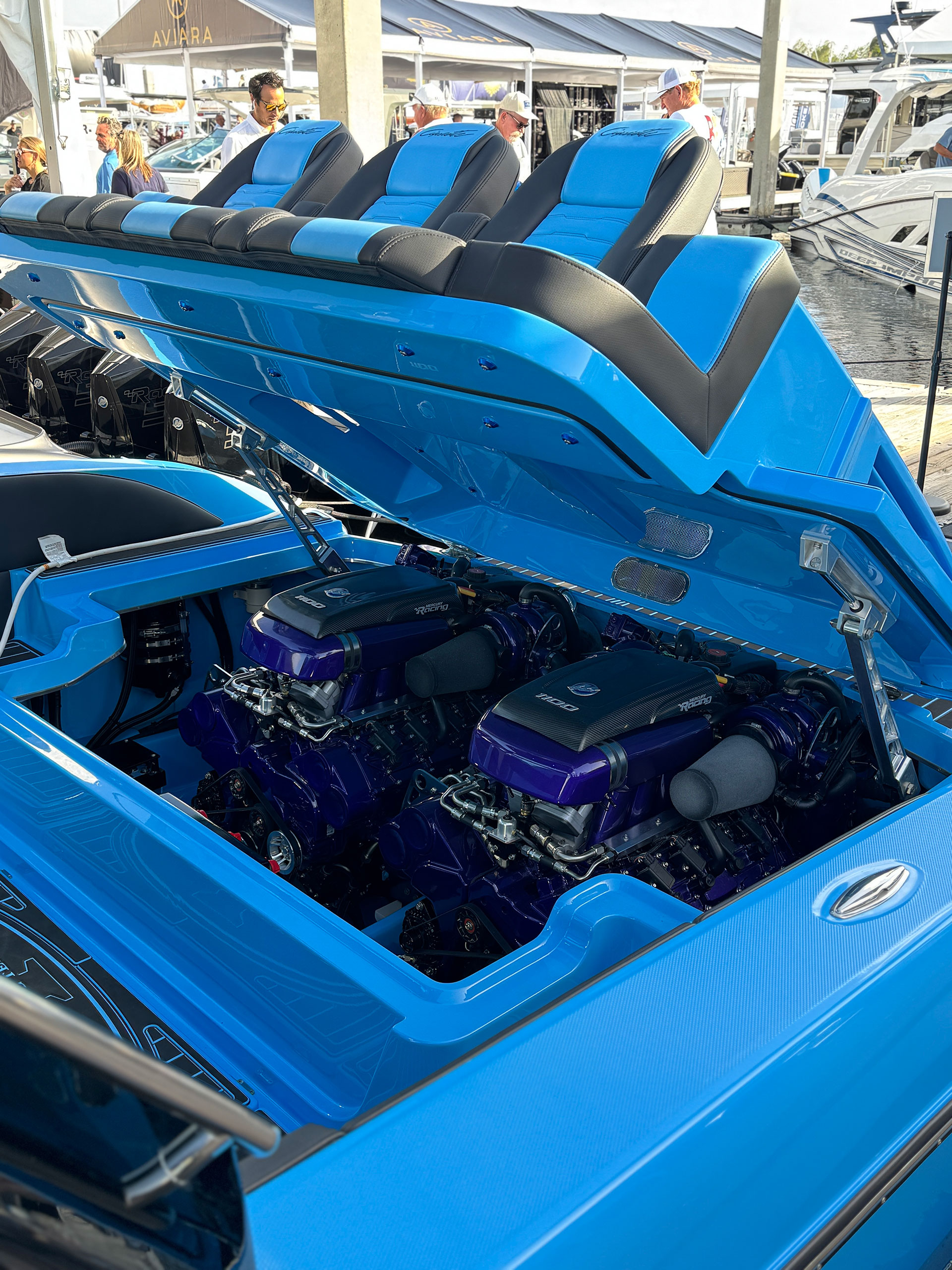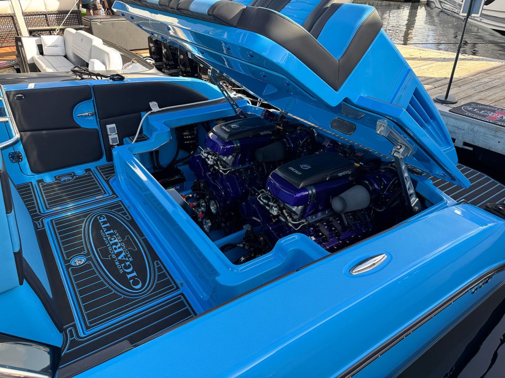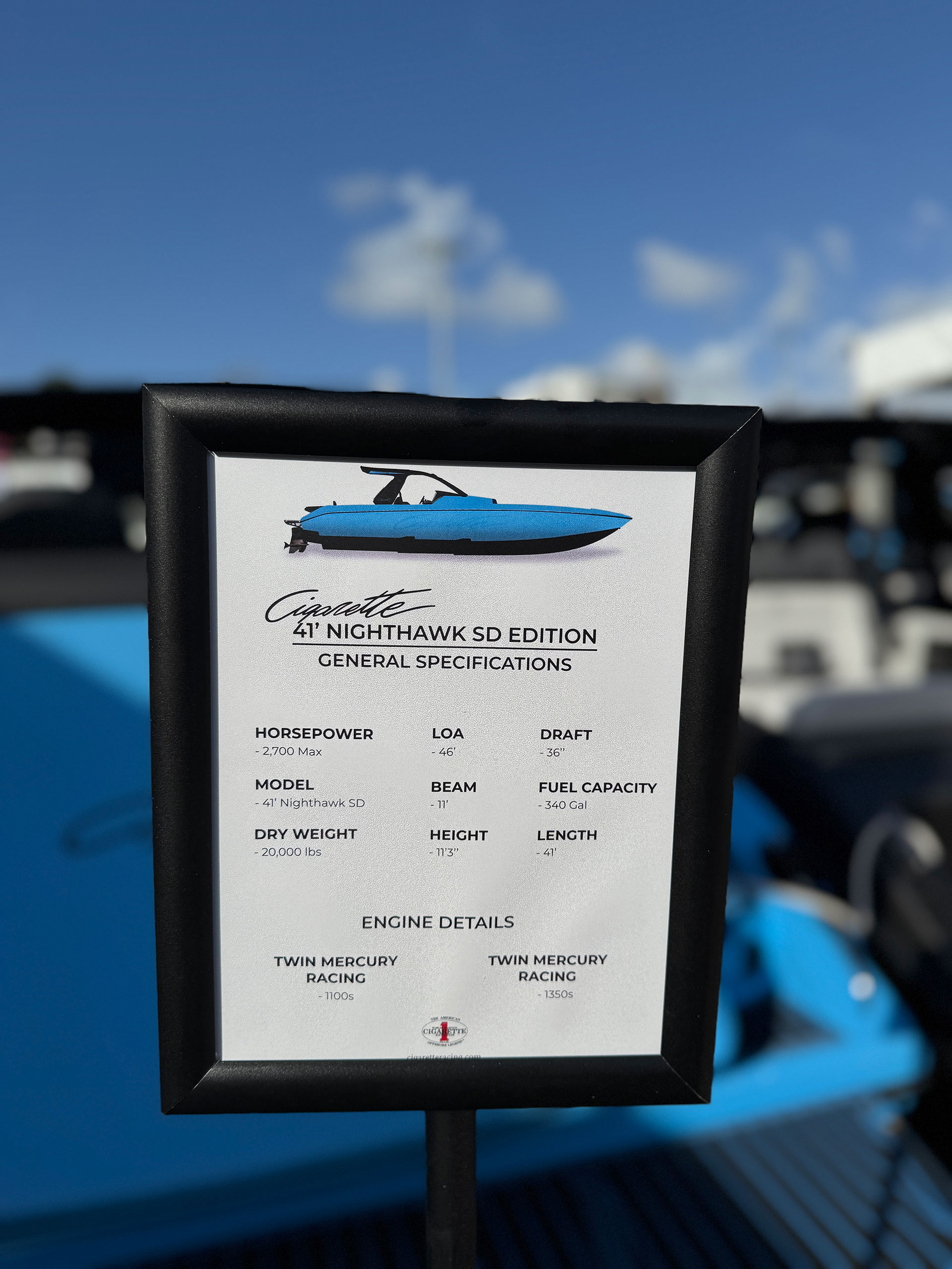 This badass 41′ Nighthawk SD edition sports twin Mercury Racing 1100’s but can be equipped with twin 1350’s for 2700 horsepower. Sporting a 36″ draft, 11′ beam, 11′ 3″ overall height, a dry weight of 20,000 lbs with a 340 gallon fuel capacity this boat is sure to turn heads.