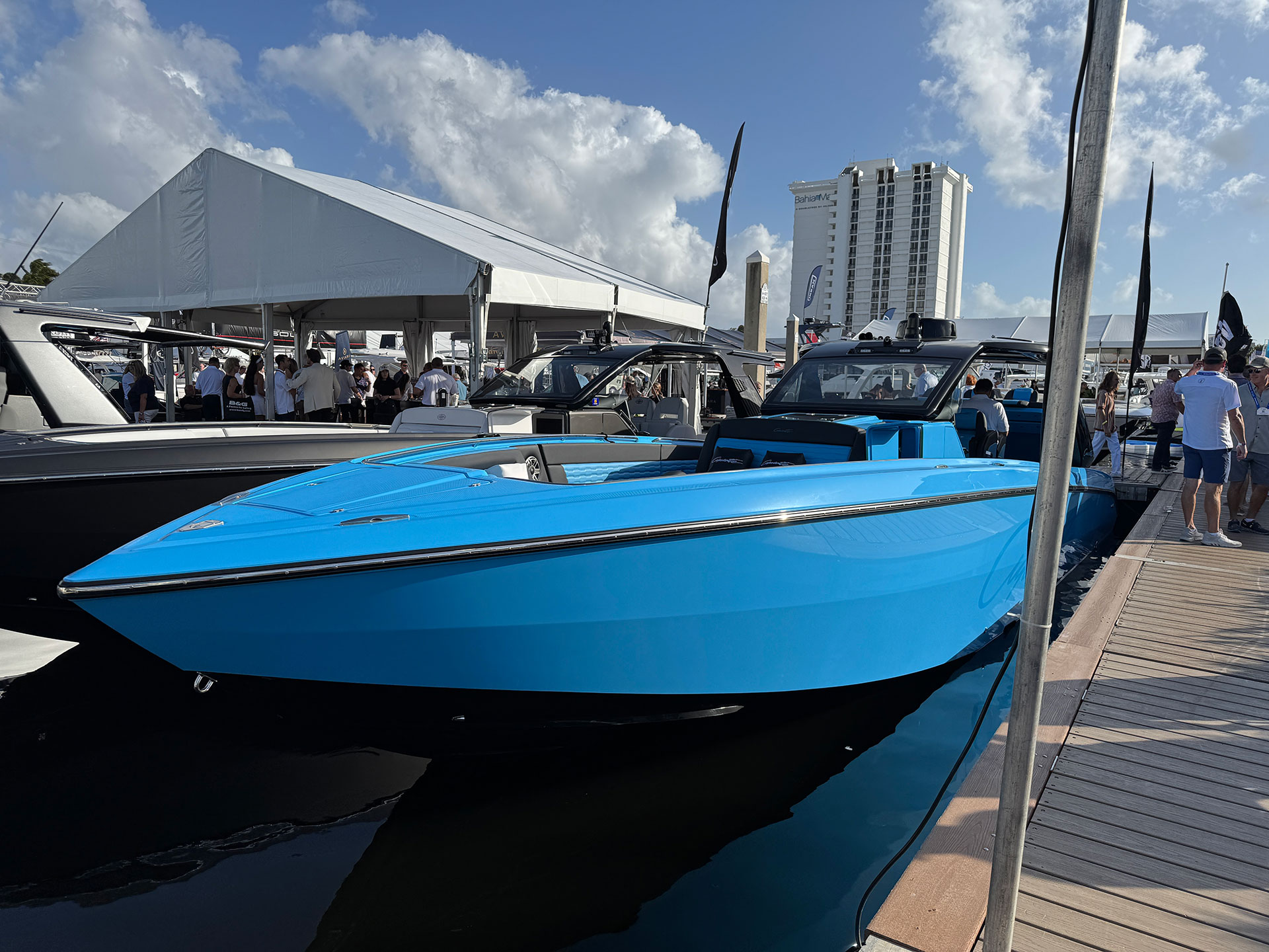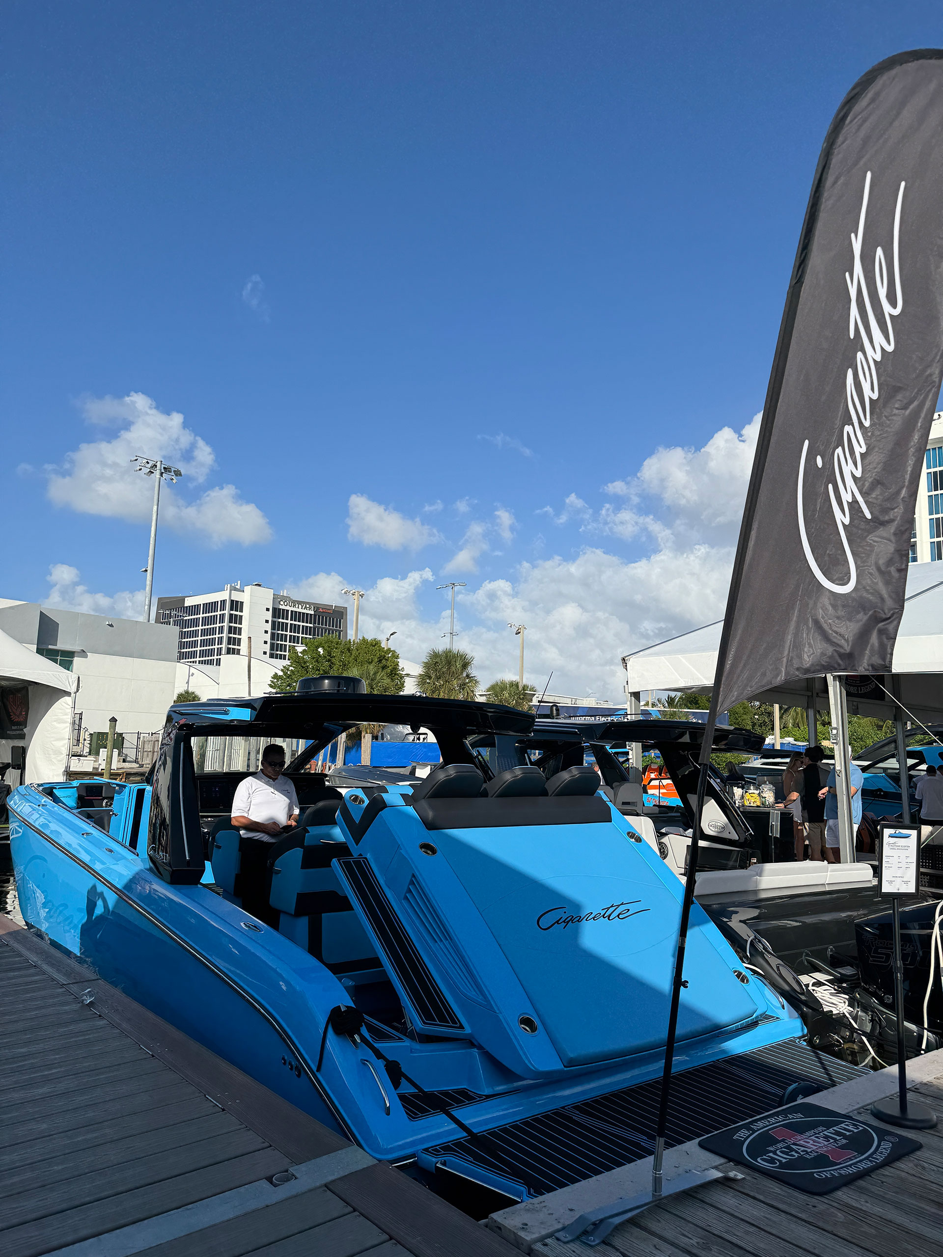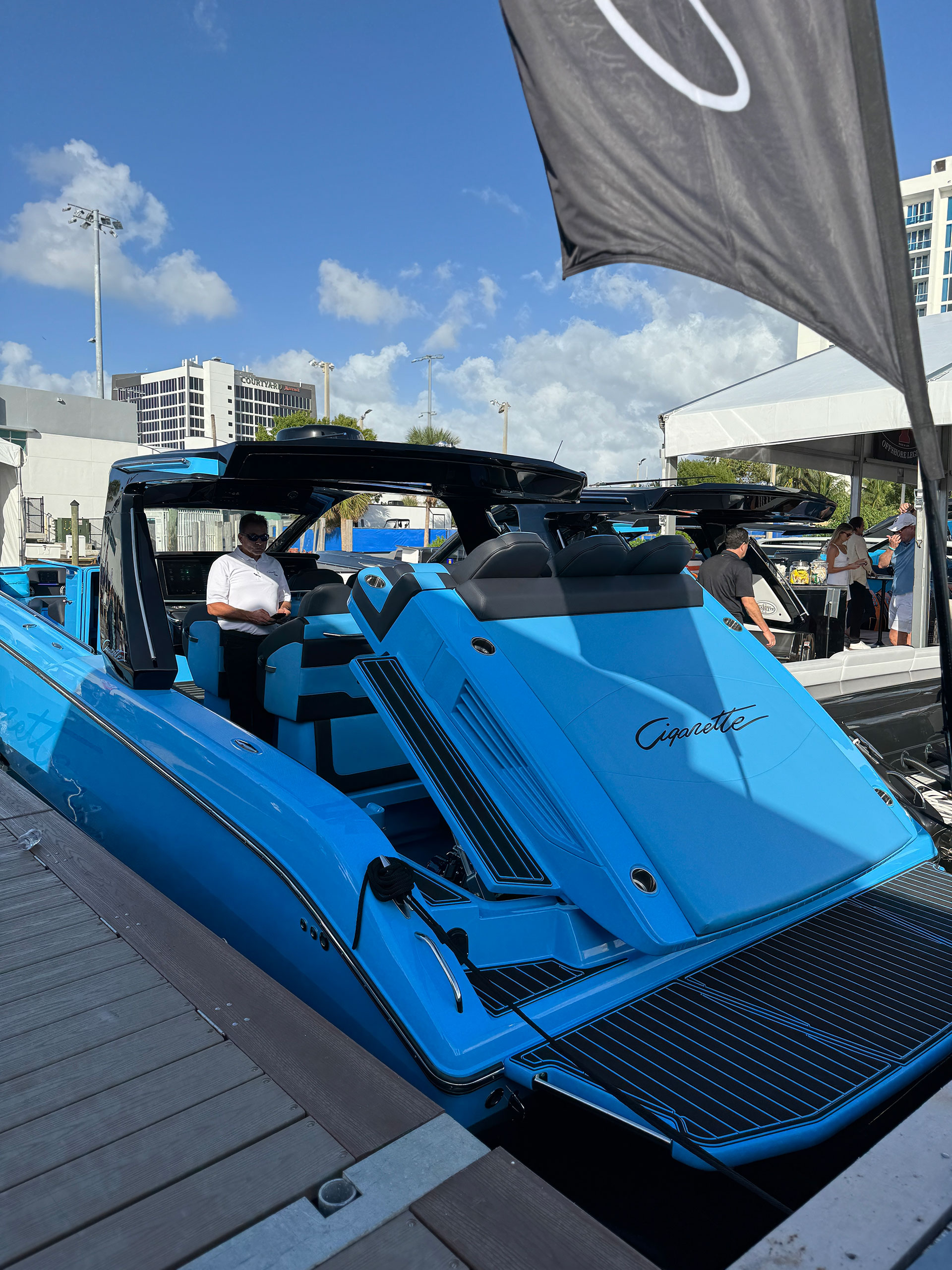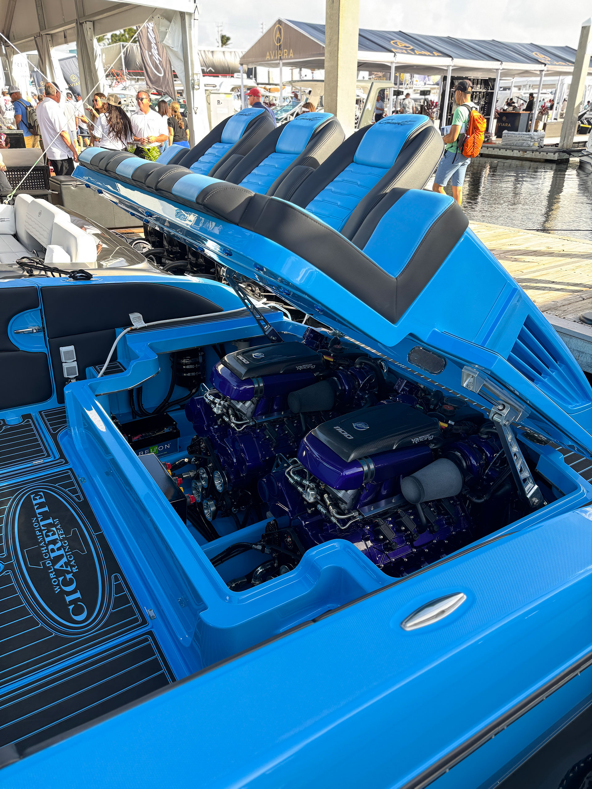This badass 41′ Nighthawk SD edition sports twin Mercury Racing 1100’s but can be equipped with twin 1350’s for 2700 horsepower. Sporting a 36″ draft, 11′ beam, 11′ 3″ overall height, a dry weight of 20,000 lbs with a 340 gallon fuel capacity this boat is sure to turn heads.