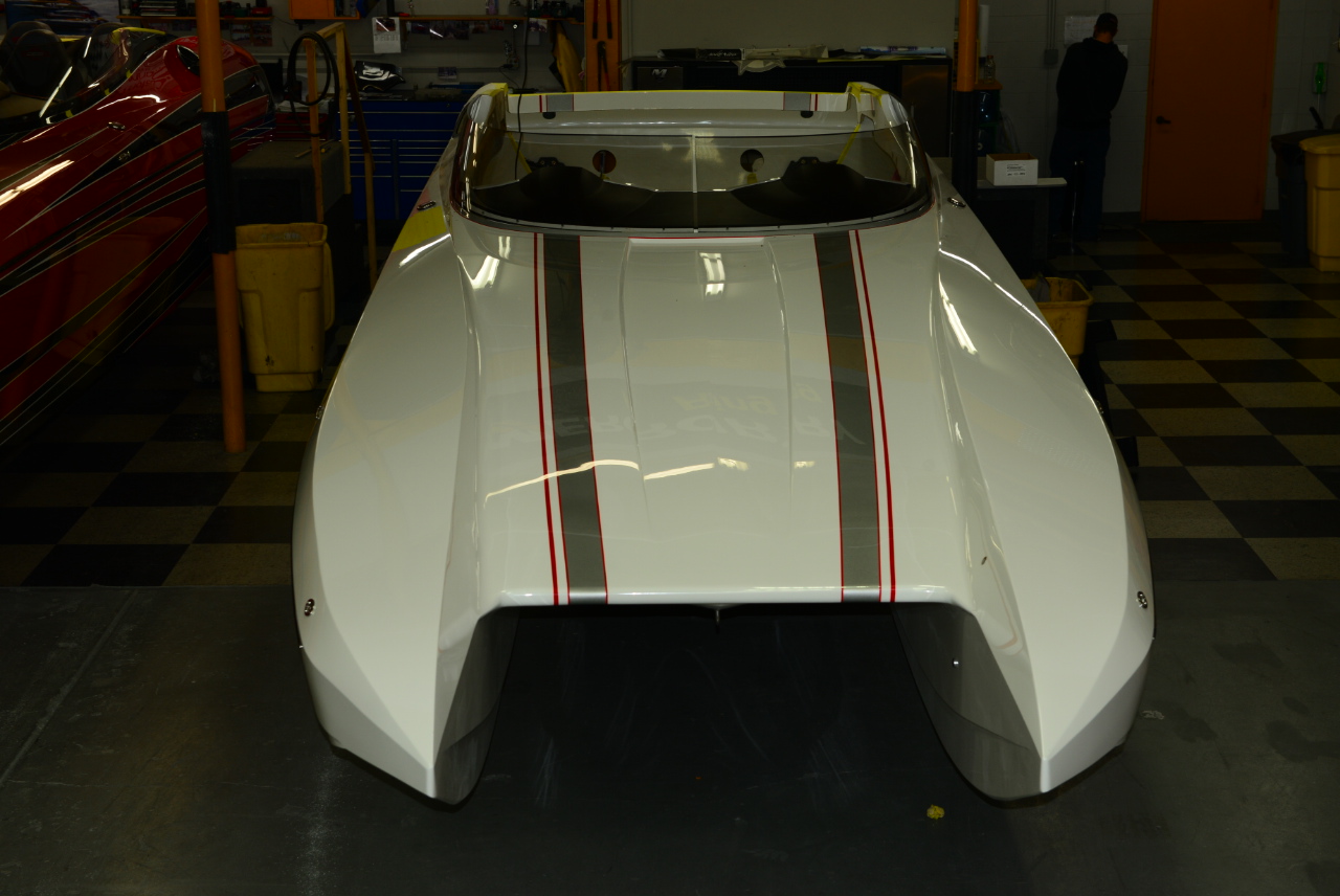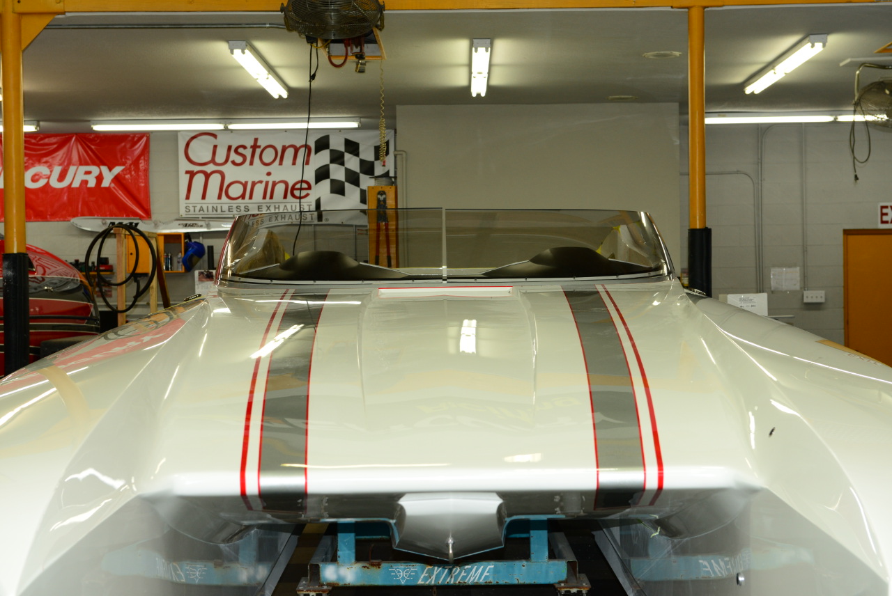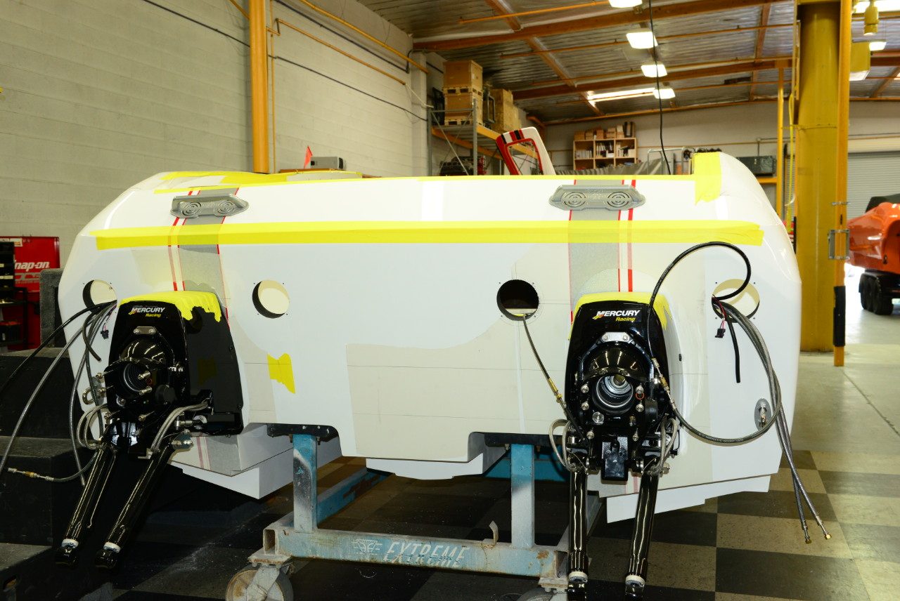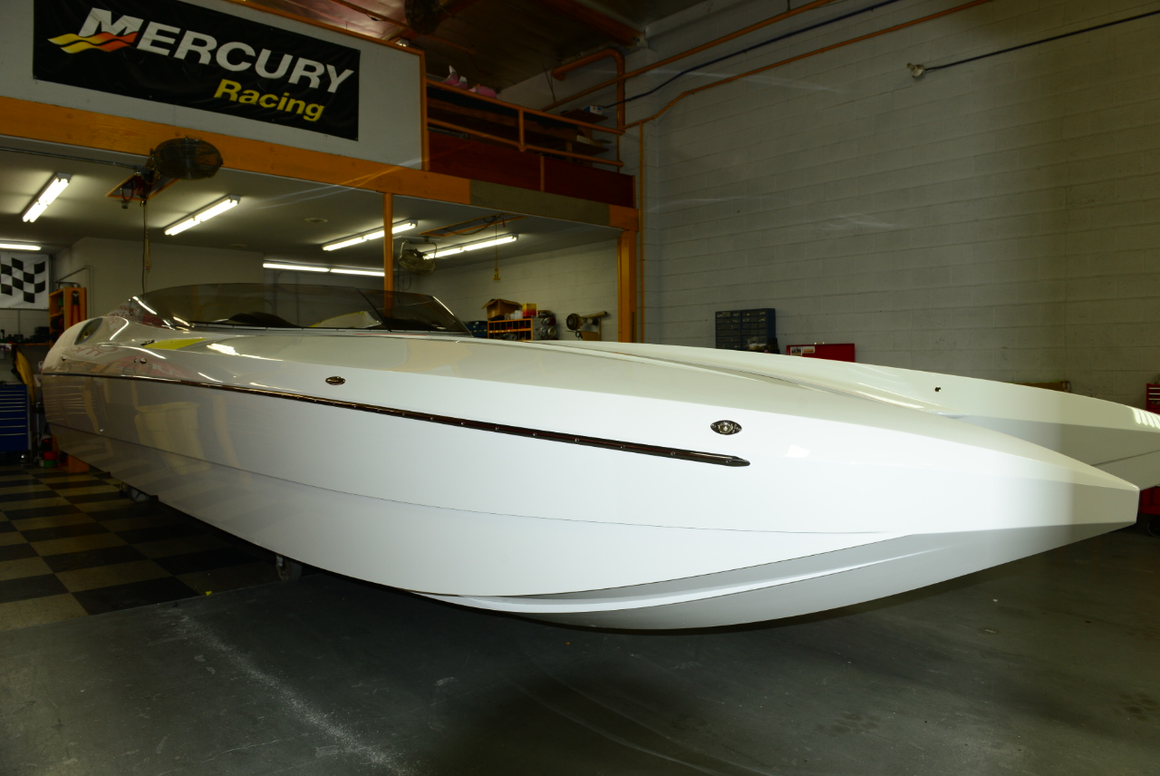 The build that really caught our eye is the M29 with Mercury Racing 565’s on XR’s. This super economical ride is projected to run between 105 and 115 MPH. The first boat set up is a spec boat and Tony told us they have quite a few leads on it. Additionally, three more M 29’s are right behind the first one, another twin 565, single 1350 with the M8 drive and the third boat will be another 565 boat.