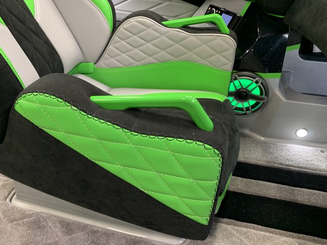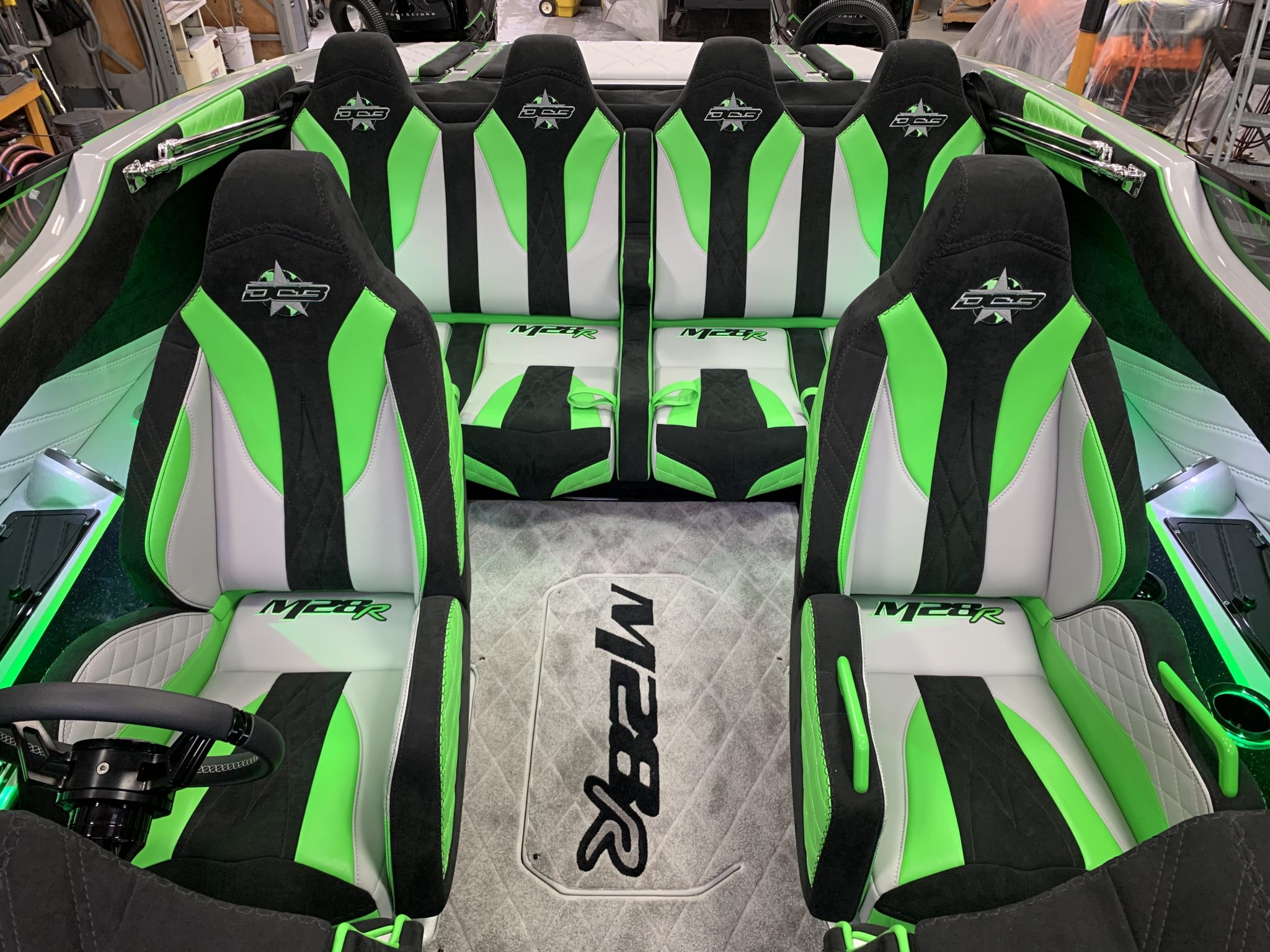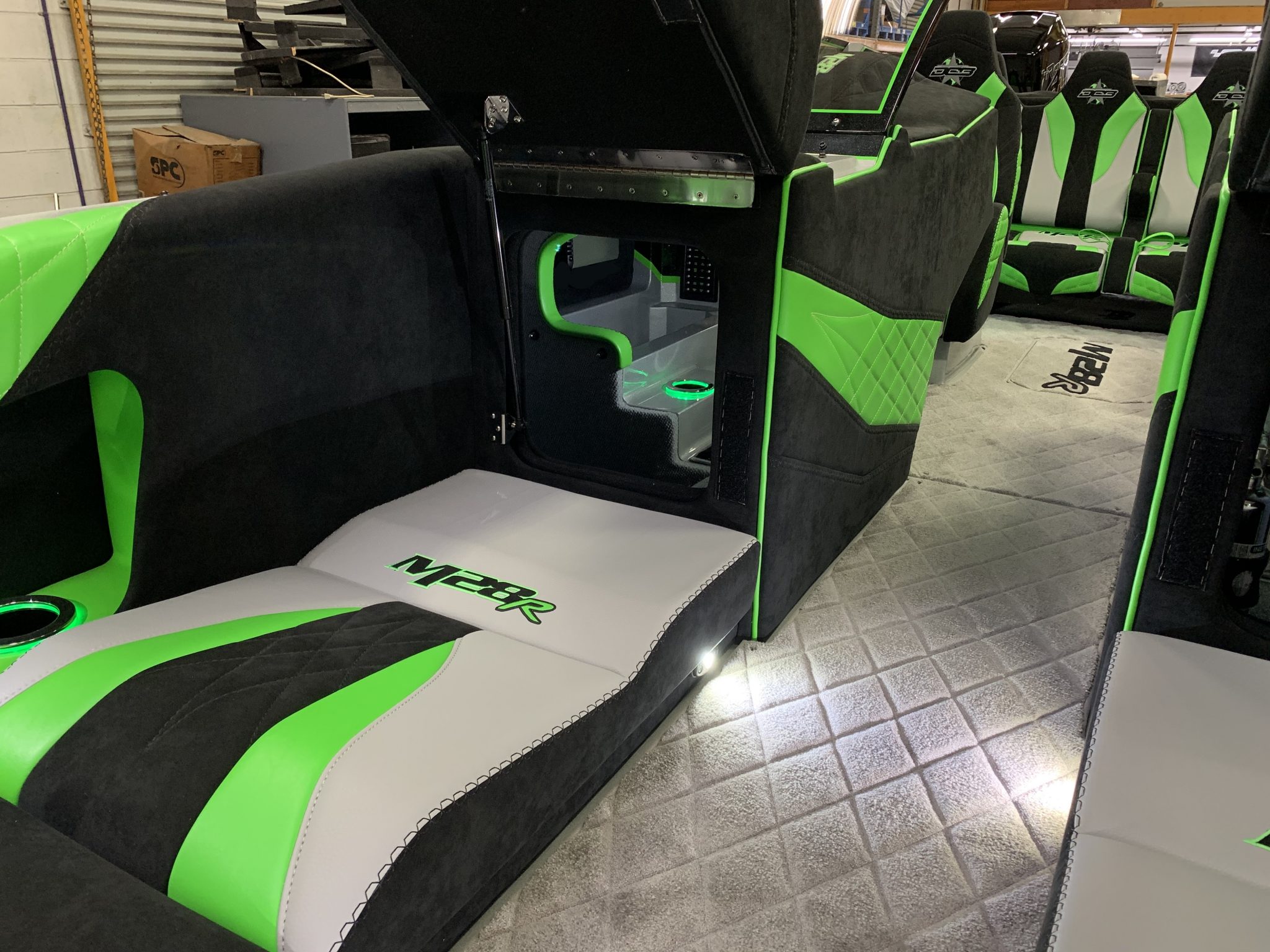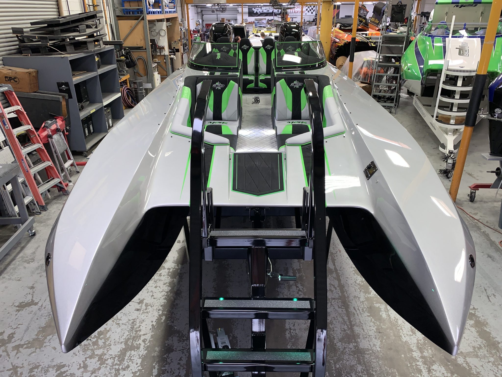 • Features: Billet foot shower at front, along with Fusion hard wired remote flushed into the inside front sponson for social distancing at the bow of the boat, flip-up lumbar seats in open bow for ease of storage and access at the helm area, two 55-gallon fuel tanks, Shaun Torrante Racing X-Act engine brackets.