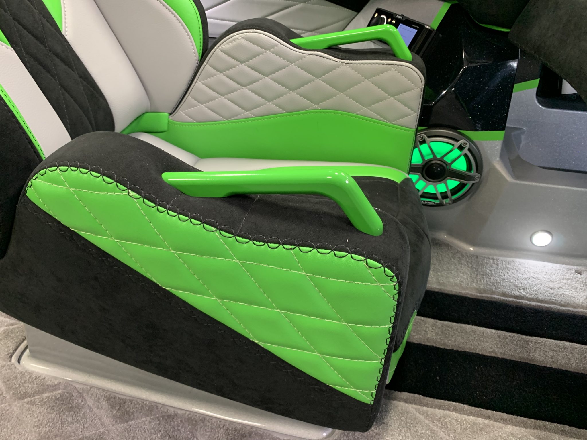 • 40” Billet swimstep with SeaDek lining and telescoping retractable ladder for easy boarding, Extreme Custom Trailer, tandem-axle with two-tone chrome & black 20” FUEL rims, black painted SS fenders and triangular drive guard, front courtesy ladder, under carriage LED mood lighting, etc.