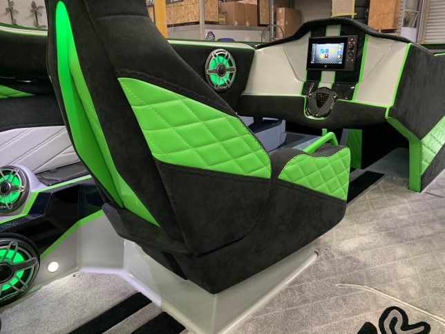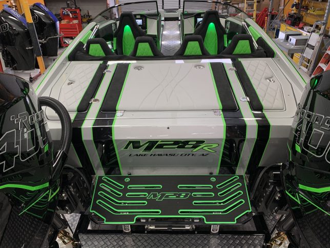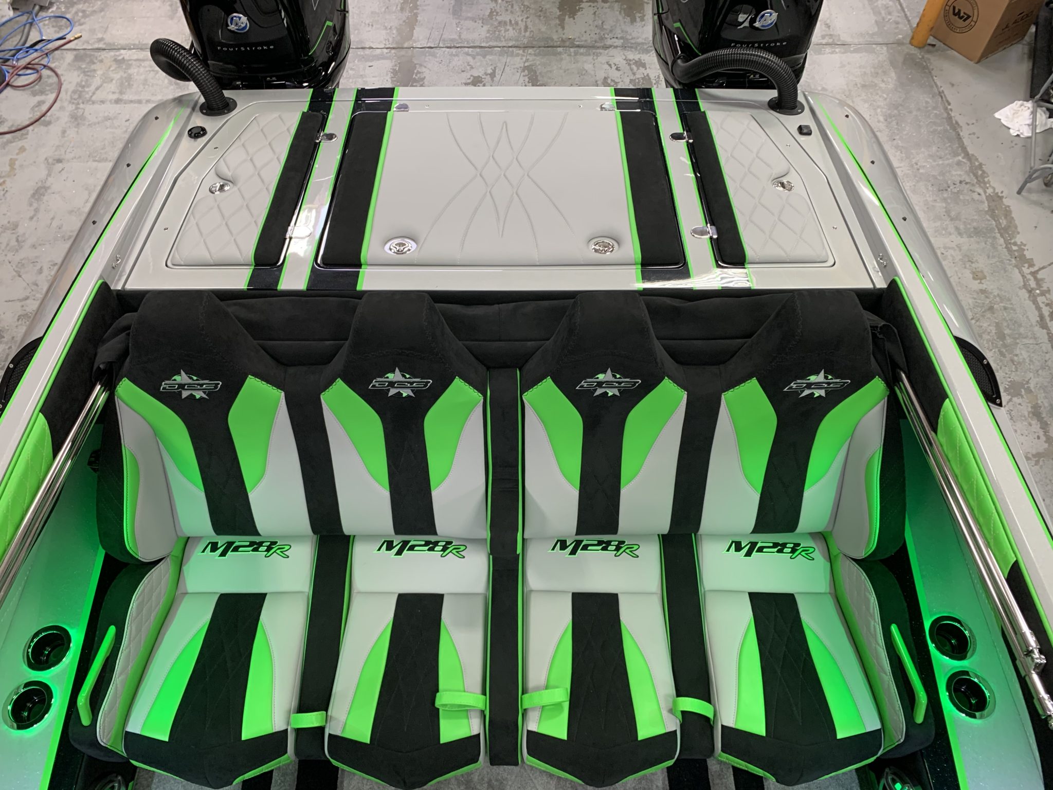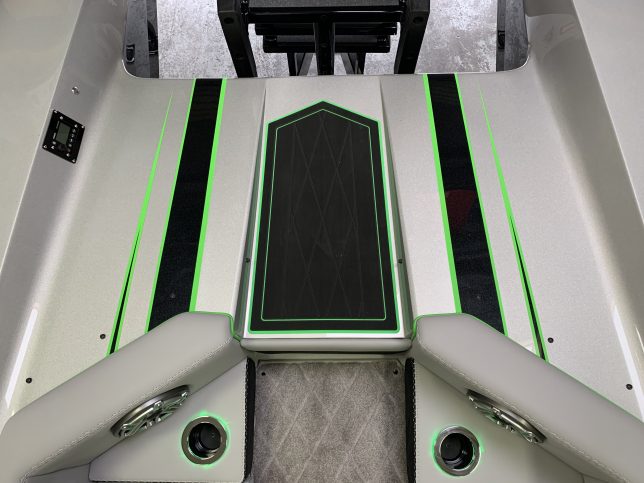 • Features: Billet foot shower at front, along with Fusion hard wired remote flushed into the inside front sponson for social distancing at the bow of the boat, flip-up lumbar seats in open bow for ease of storage and access at the helm area, two 55-gallon fuel tanks, Shaun Torrante Racing X-Act engine brackets.