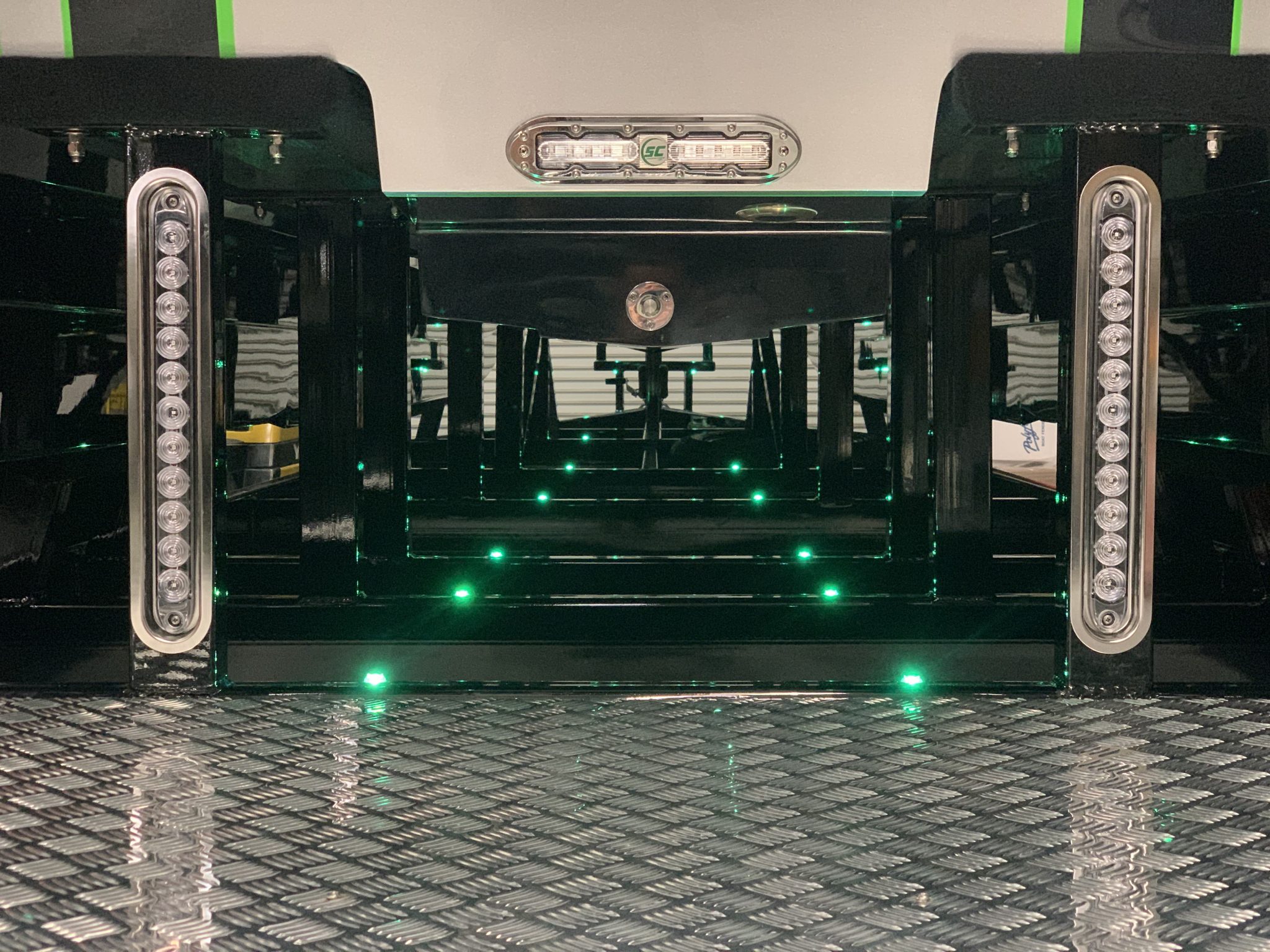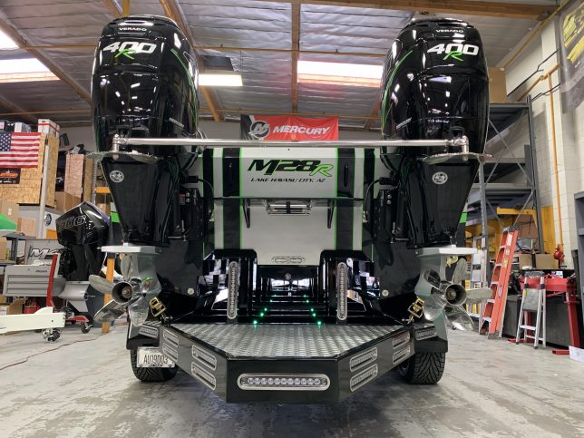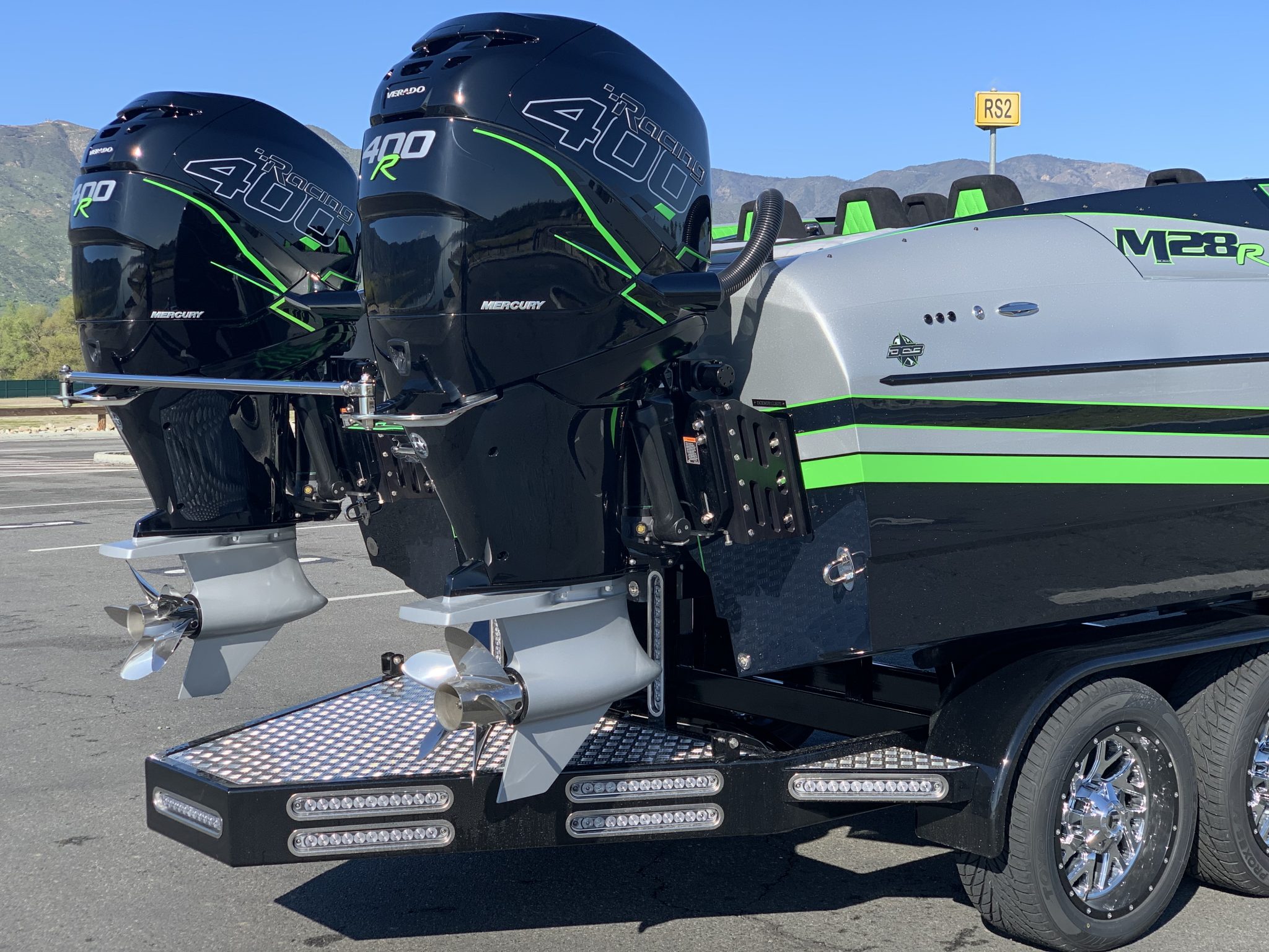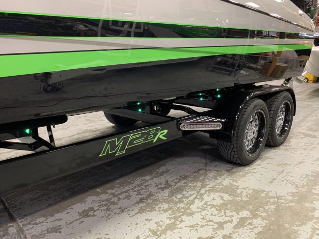 • 40” Billet swimstep with SeaDek lining and telescoping retractable ladder for easy boarding, Extreme Custom Trailer, tandem-axle with two-tone chrome & black 20” FUEL rims, black painted SS fenders and triangular drive guard, front courtesy ladder, under carriage LED mood lighting, etc.