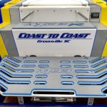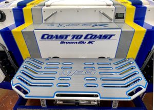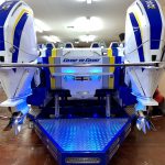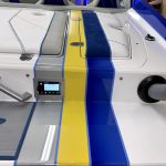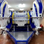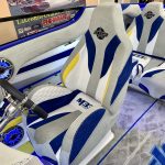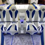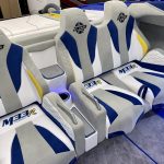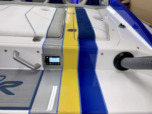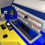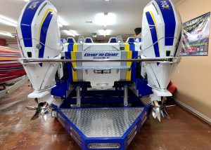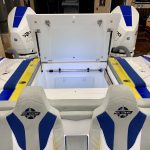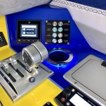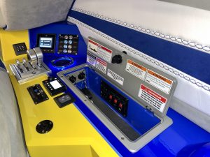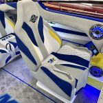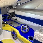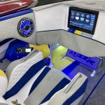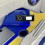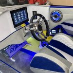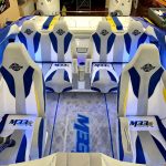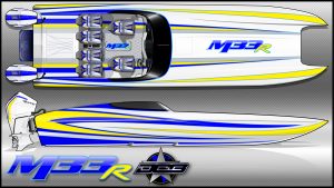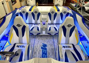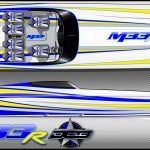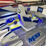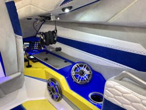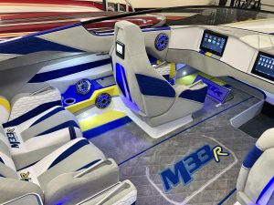 The boat, which features a 9’7” beam, features STR Brackets (courtesy Shaun Torrente Racing), custom matching carpet kit with shaved diamonds in the fabric, Phase III gelcoat scheme and Mercury Zero Effort DTS shifter/throttle. The M33R also sports a six-person intercom system with VHF boat-to-boat communication (aka the “DCB Channel”).
