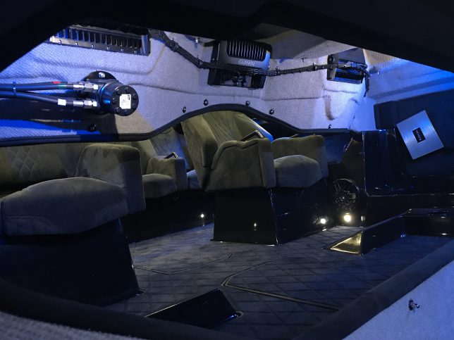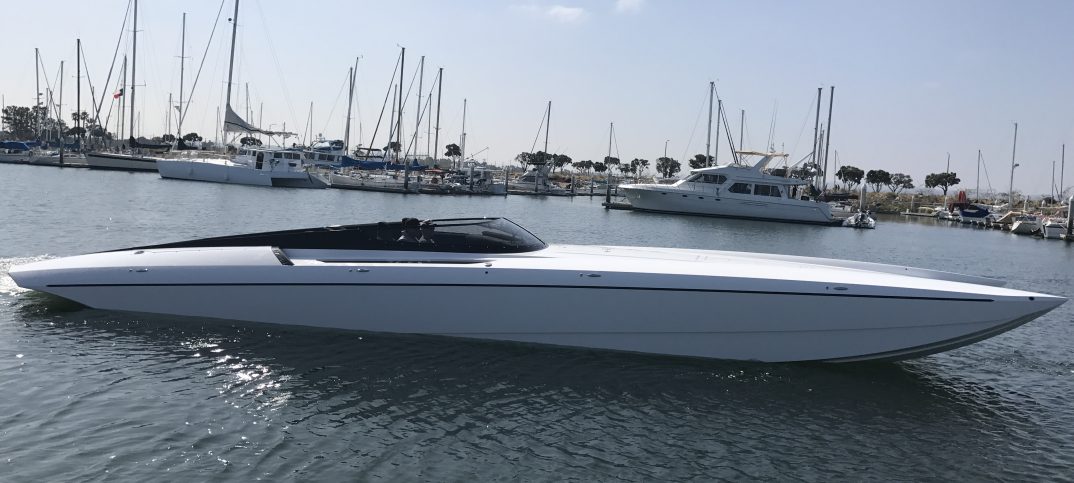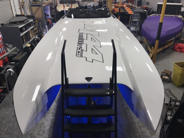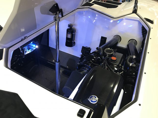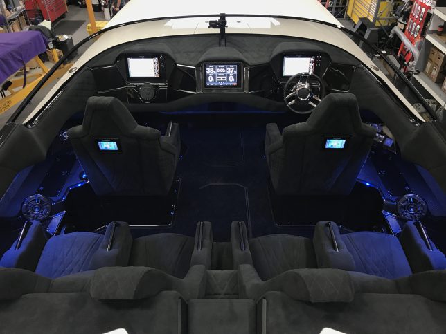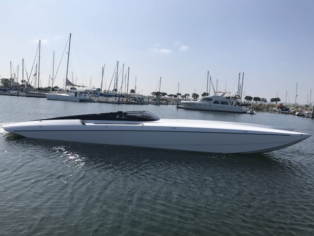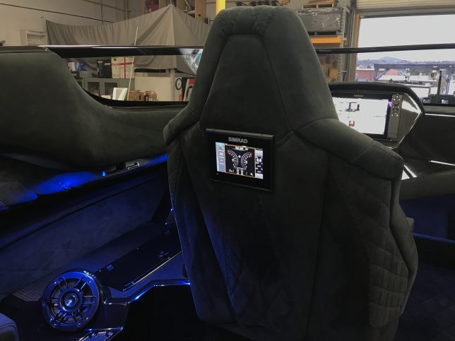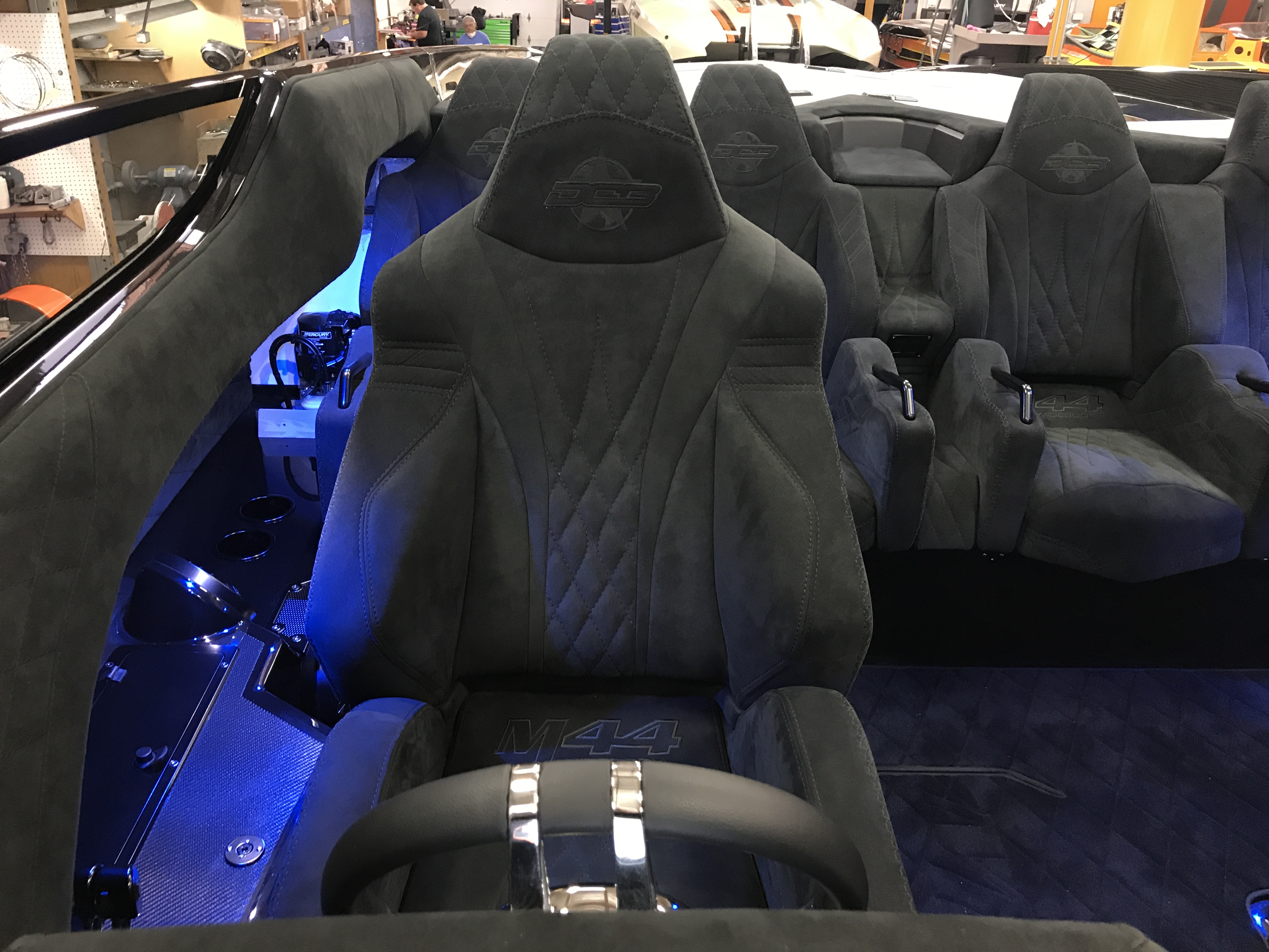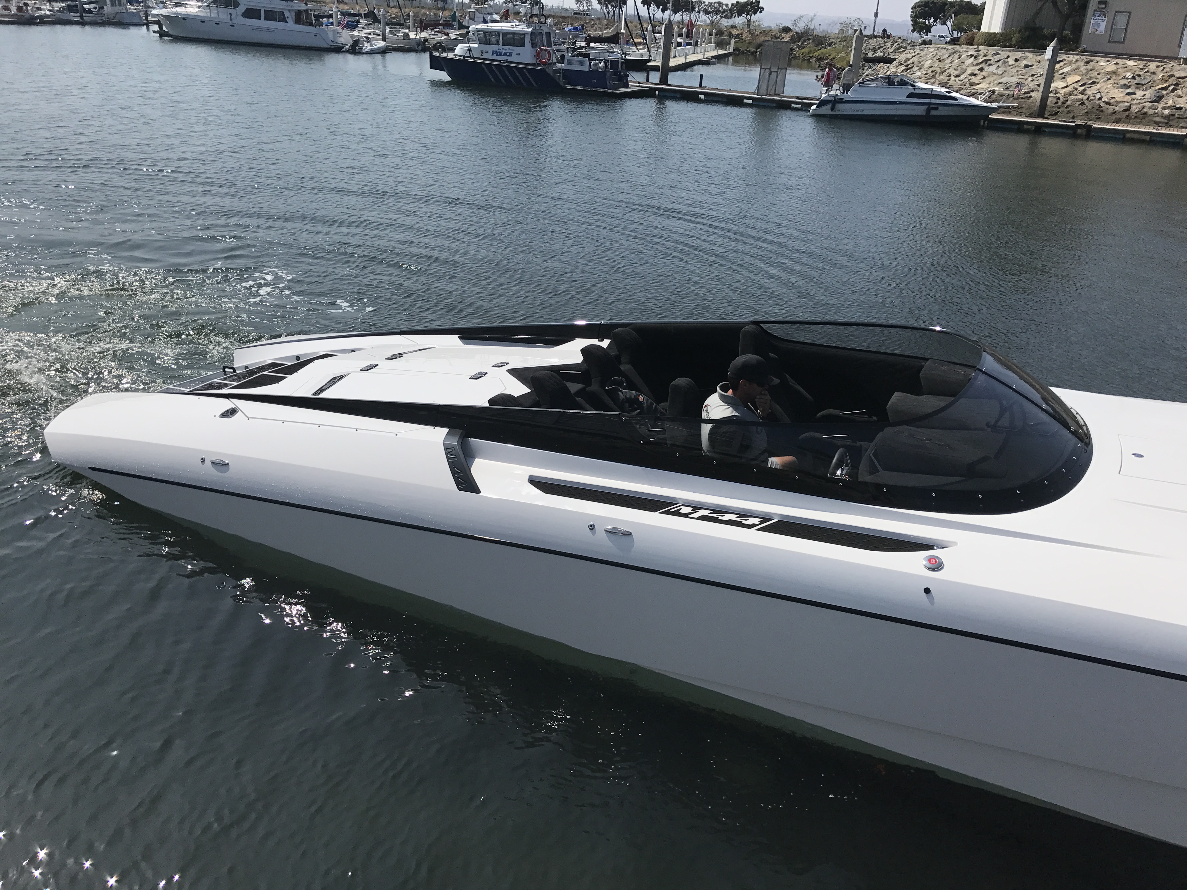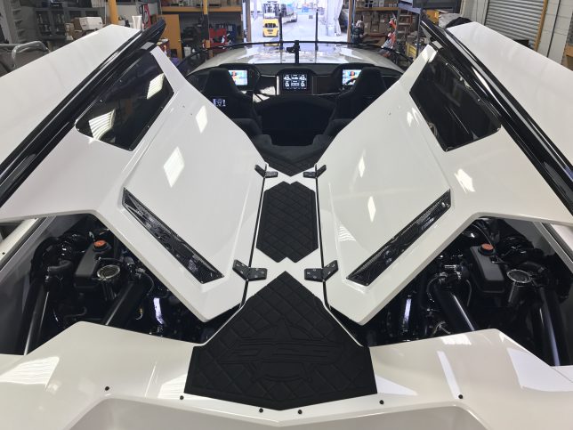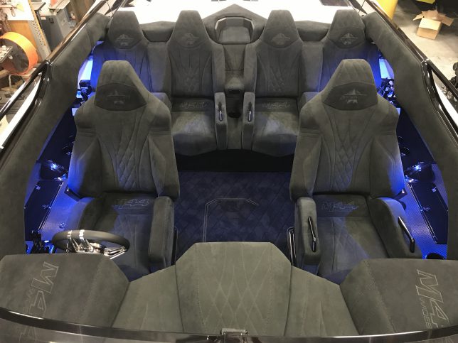 The pearl white M44 powered by Mercury 1100s and sporting SSM#6’s, features a Vacuum Infused Resin (VIR) process, balsa-cored, with some carbon-fiber reinforcements and the interior is 100% Alcantara.