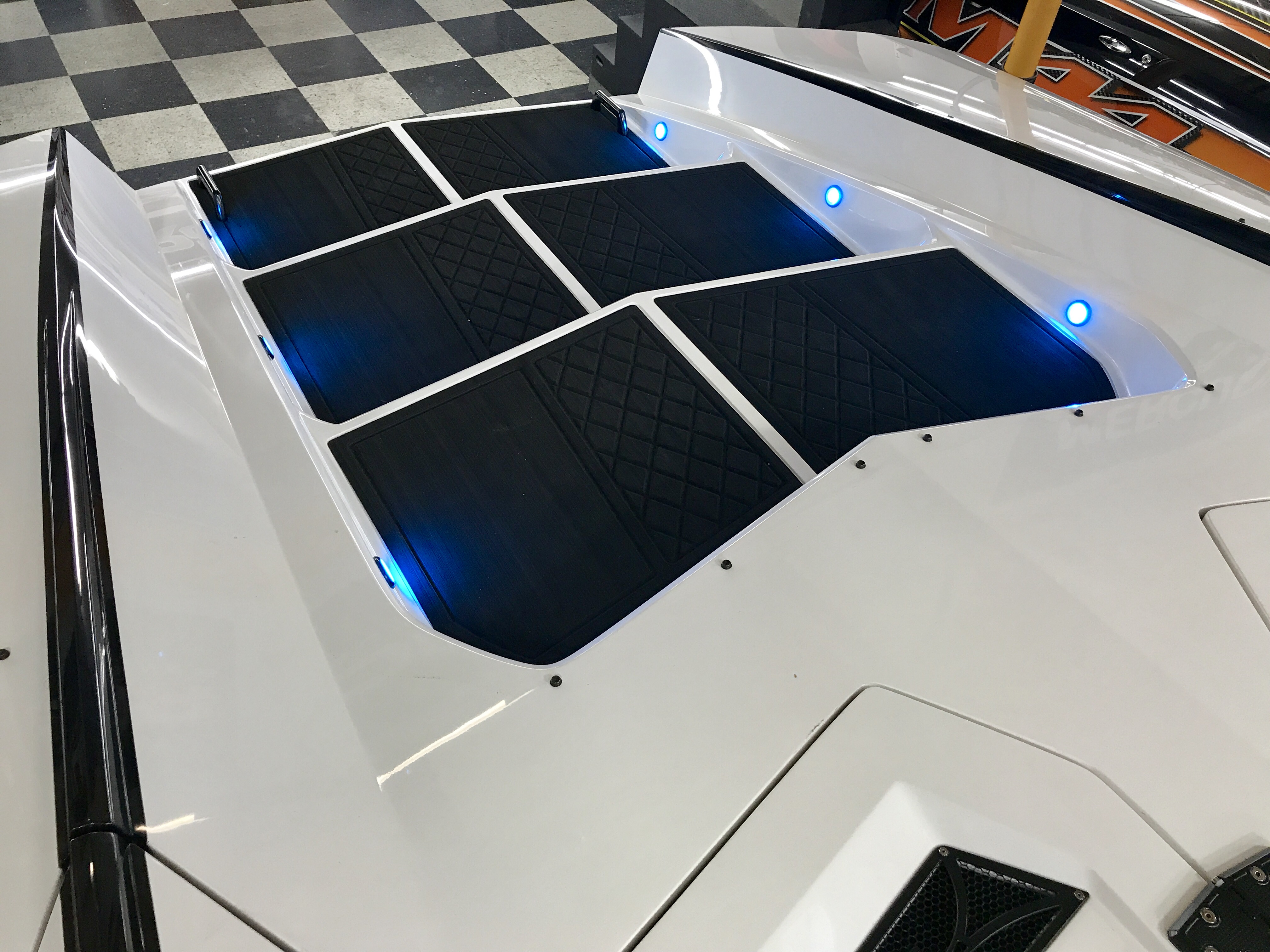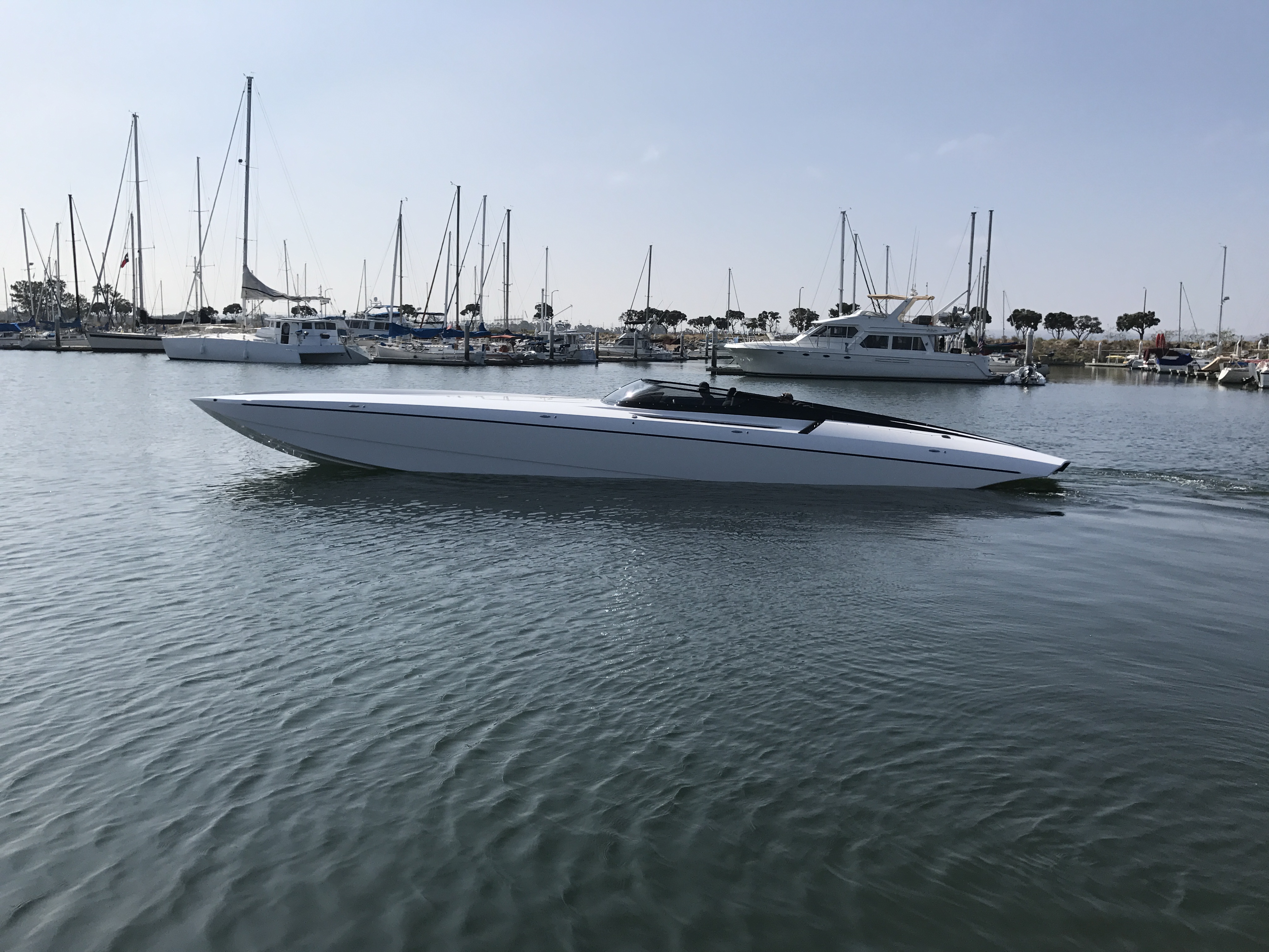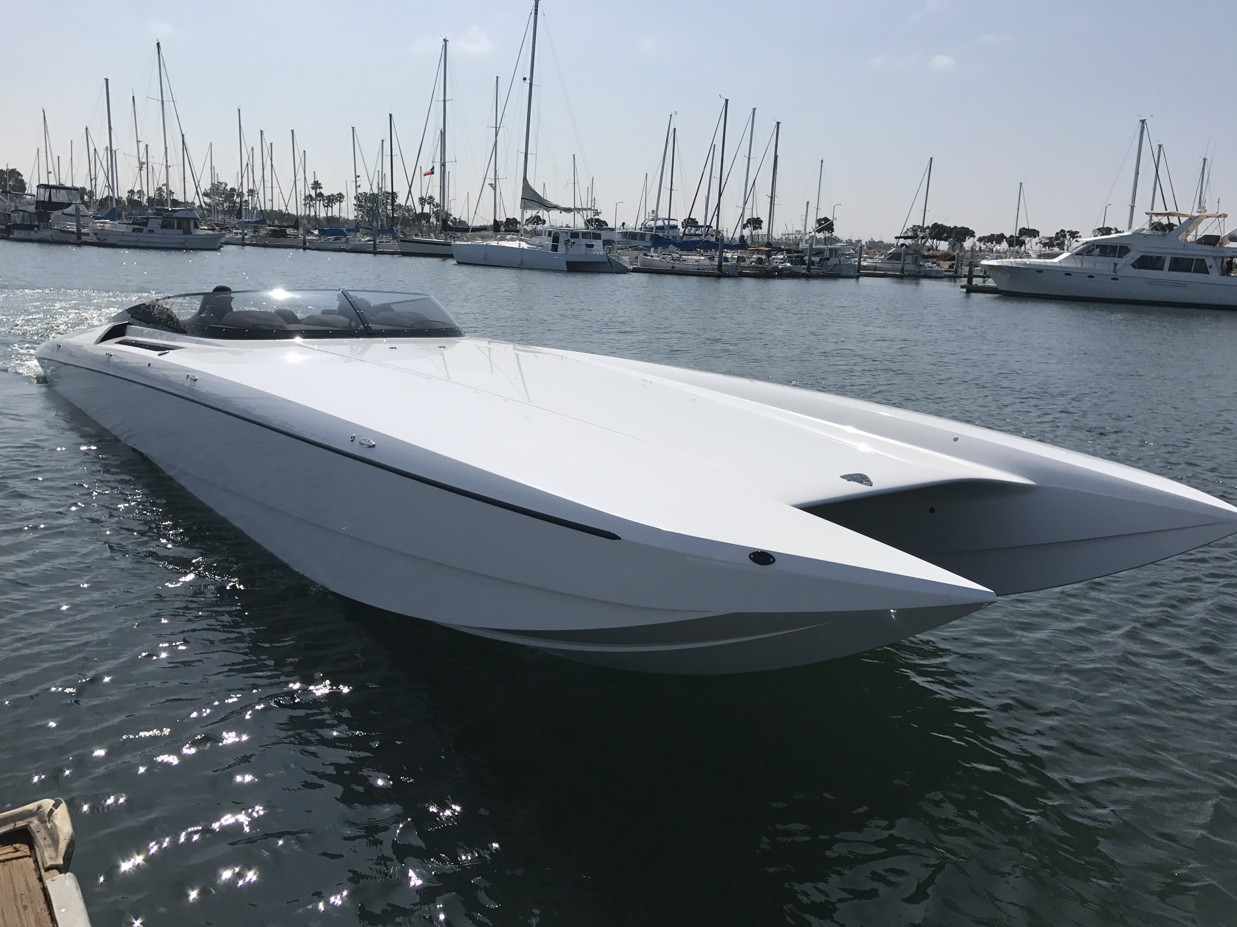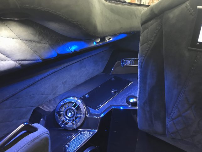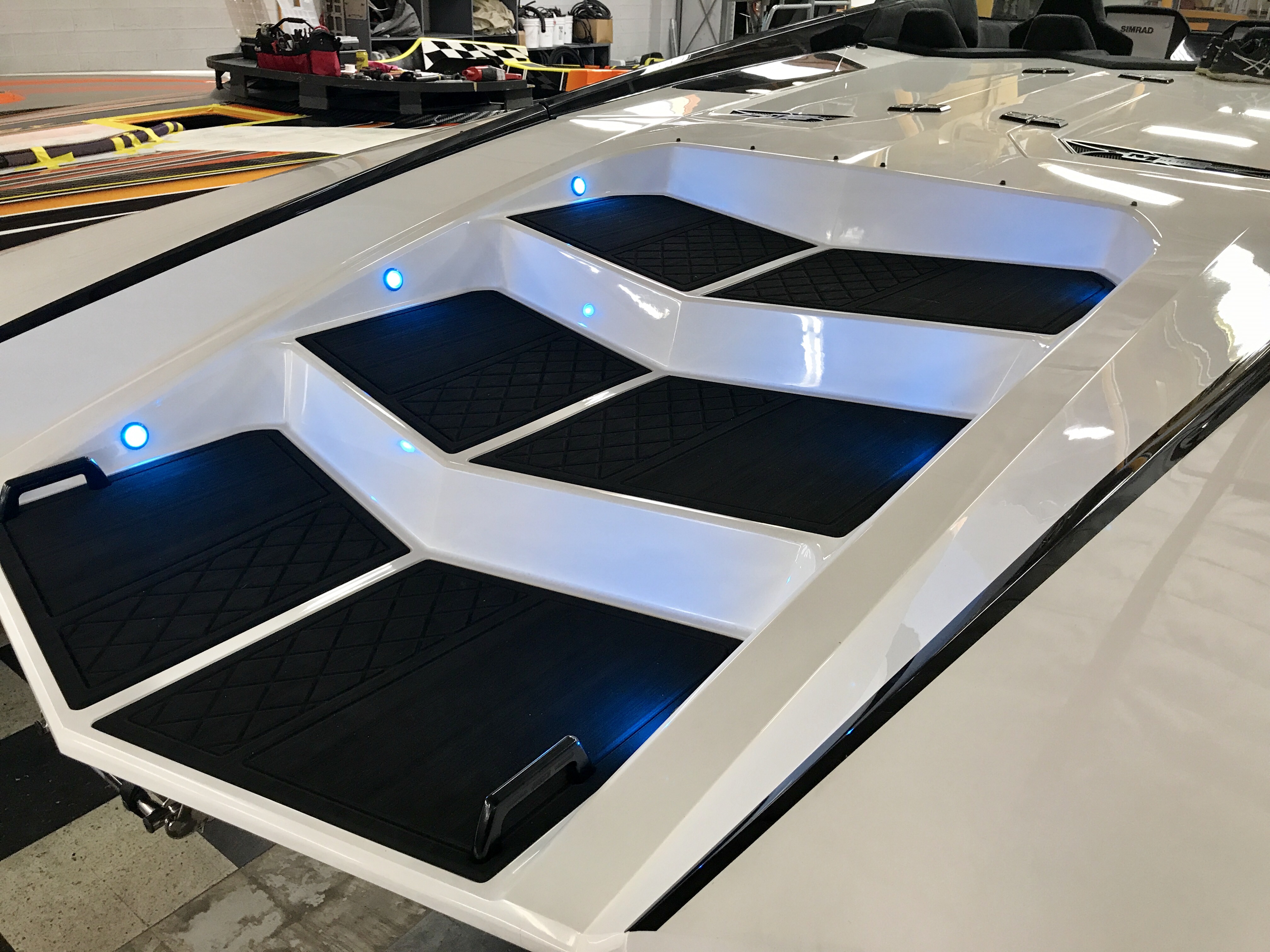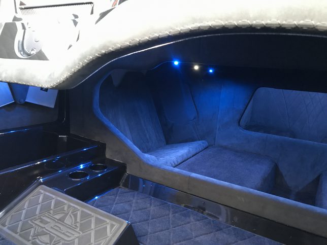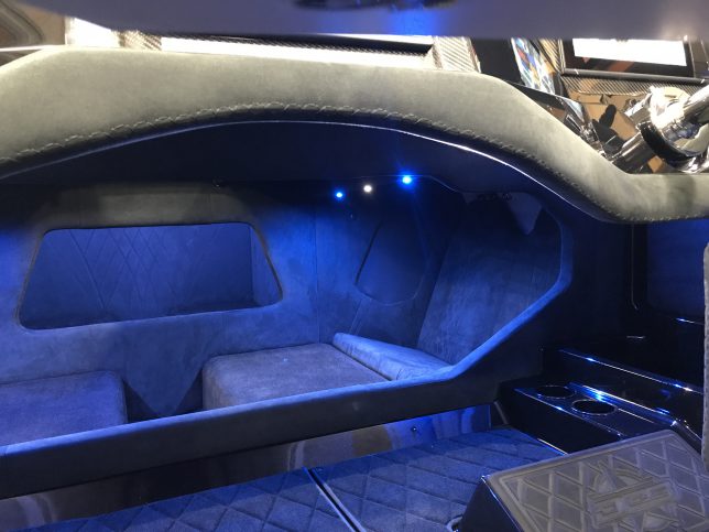 The pearl white M44 powered by Mercury 1100s and sporting SSM#6’s, features a Vacuum Infused Resin (VIR) process, balsa-cored, with some carbon-fiber reinforcements and the interior is 100% Alcantara.