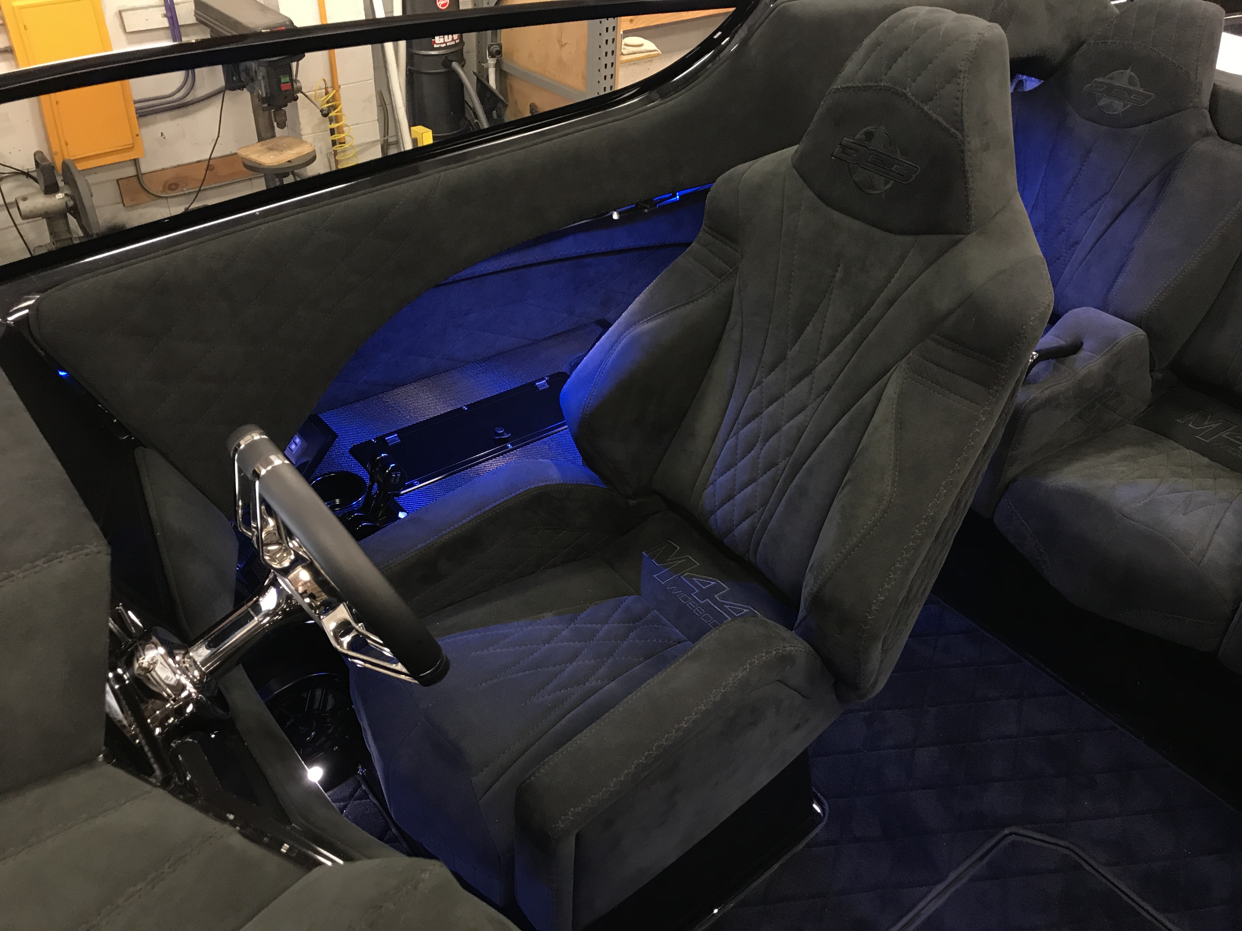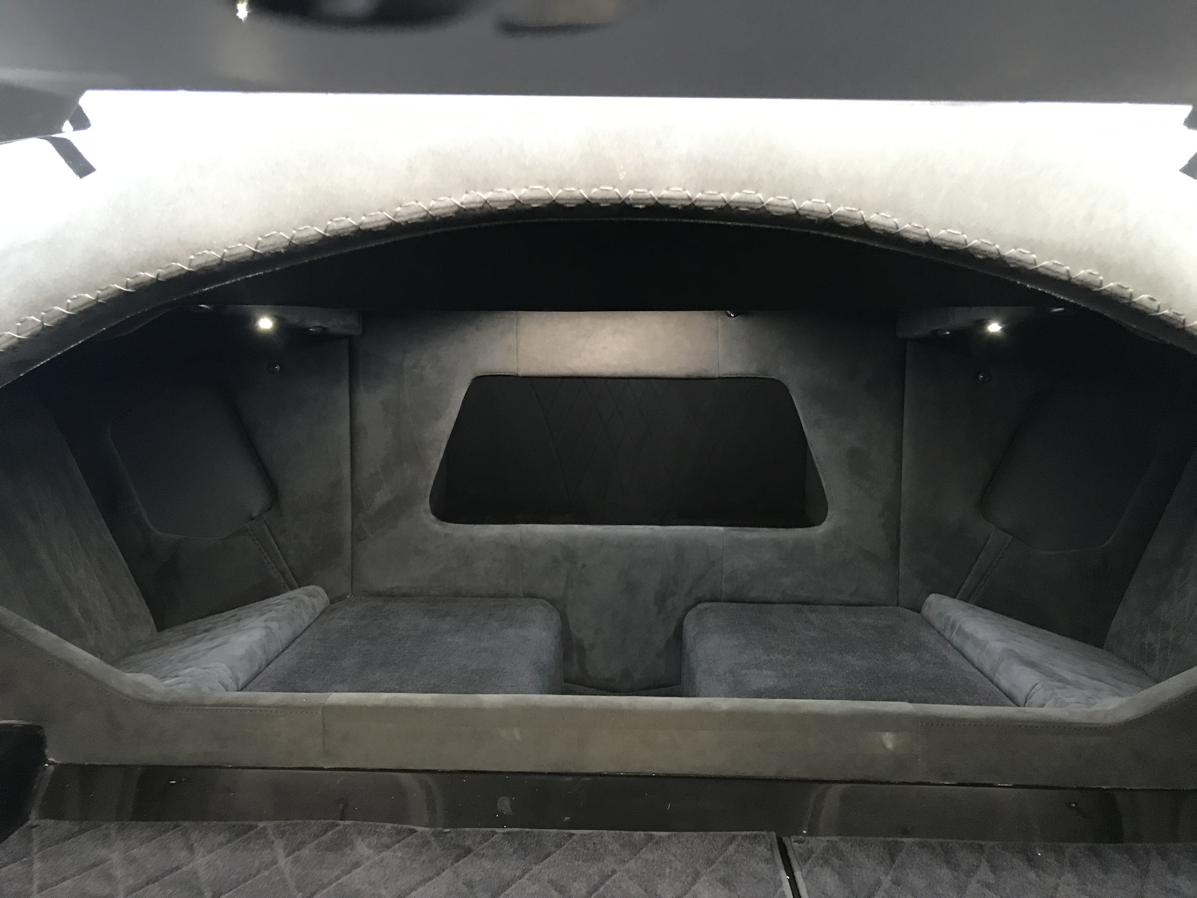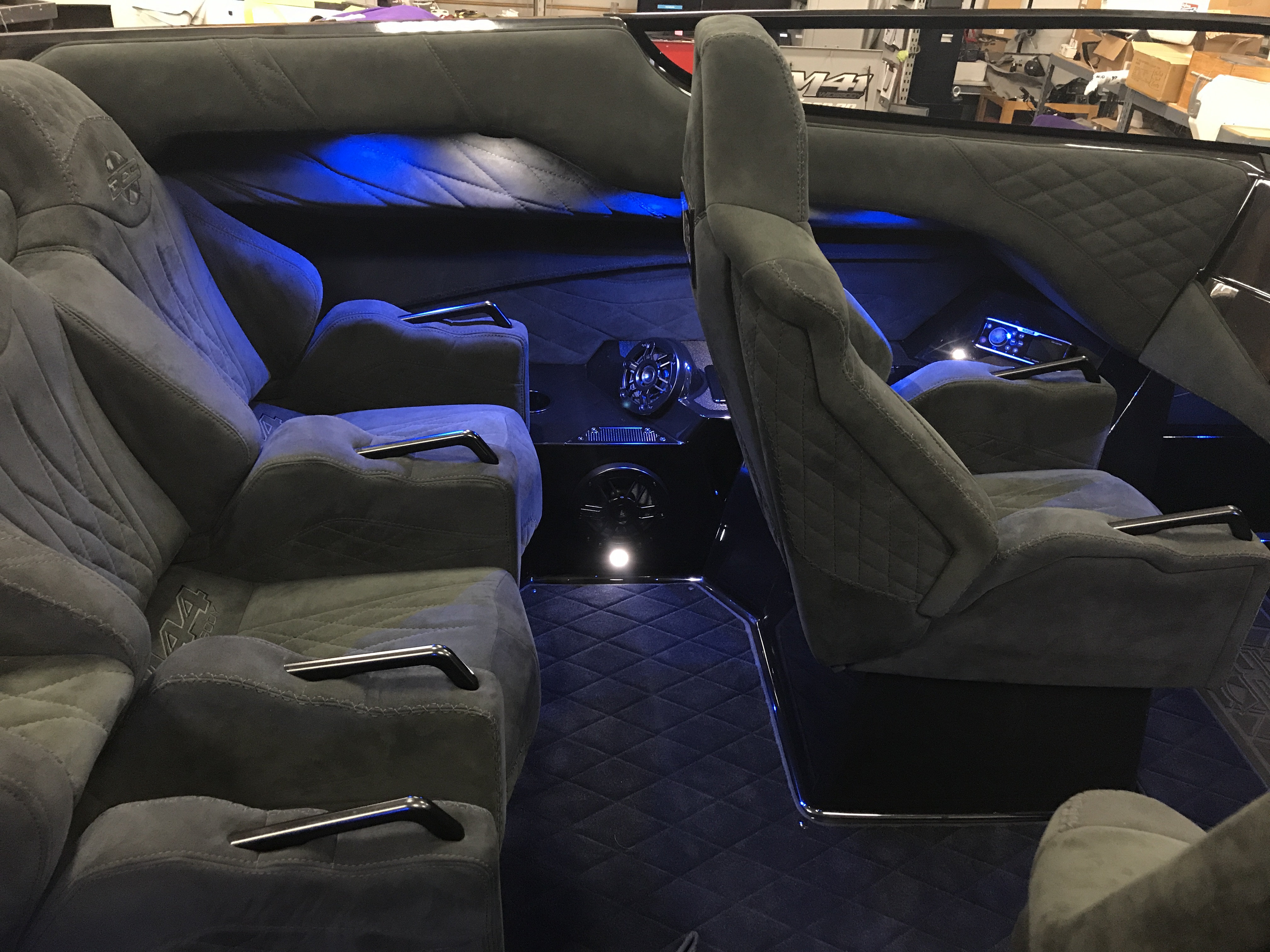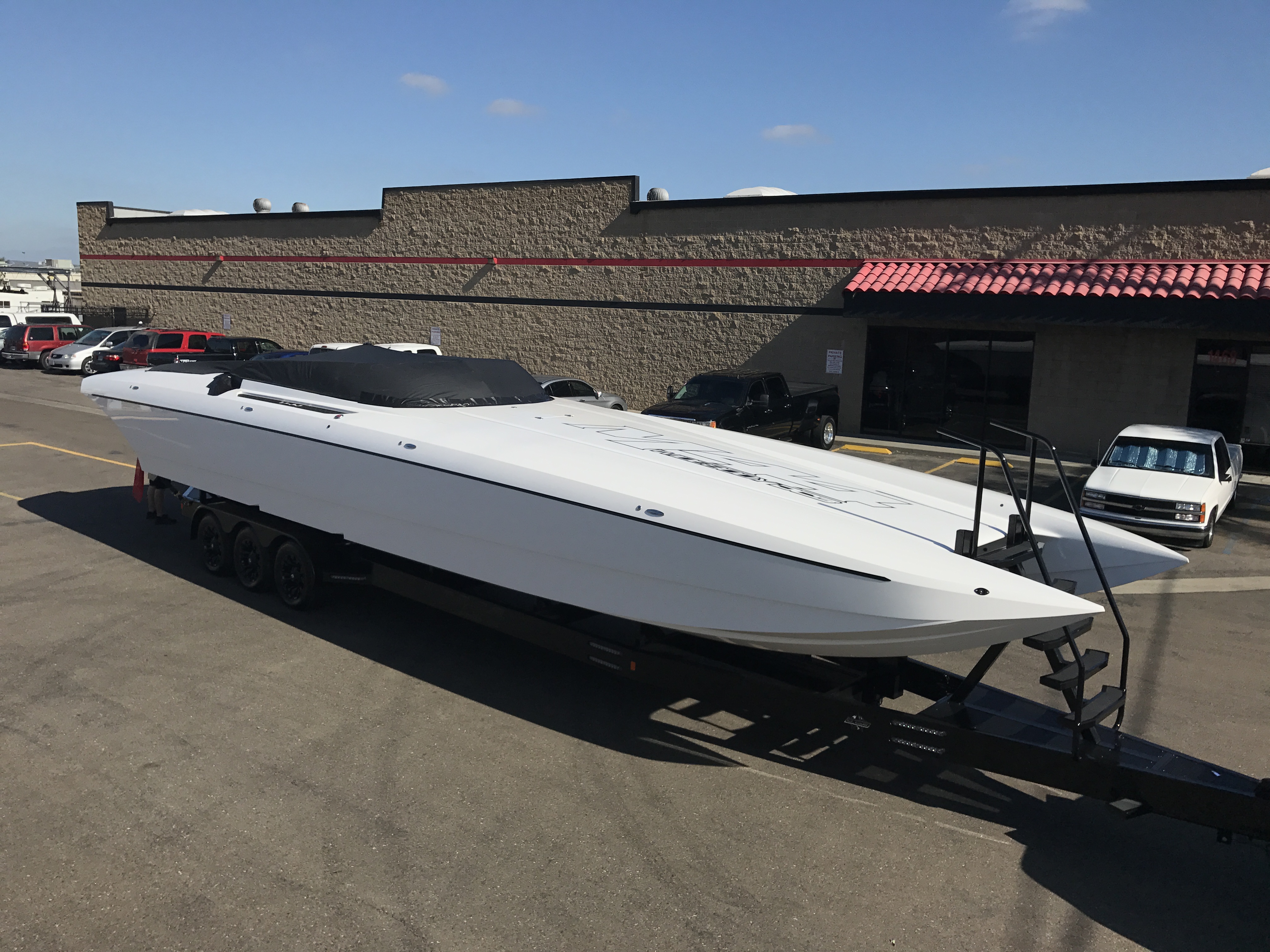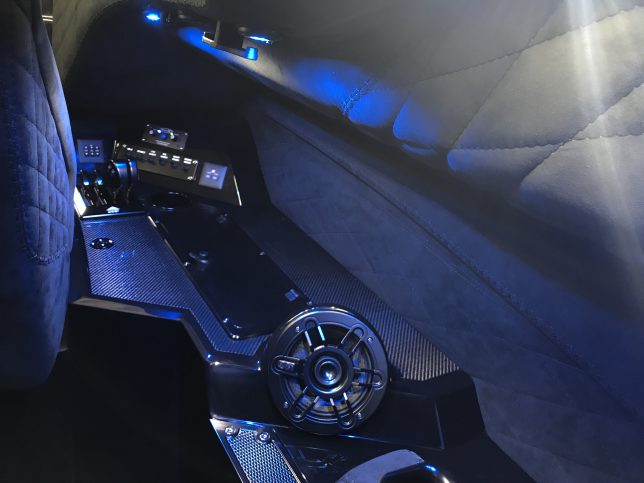 The pearl white M44 powered by Mercury 1100s and sporting SSM#6’s, features a Vacuum Infused Resin (VIR) process, balsa-cored, with some carbon-fiber reinforcements and the interior is 100% Alcantara.