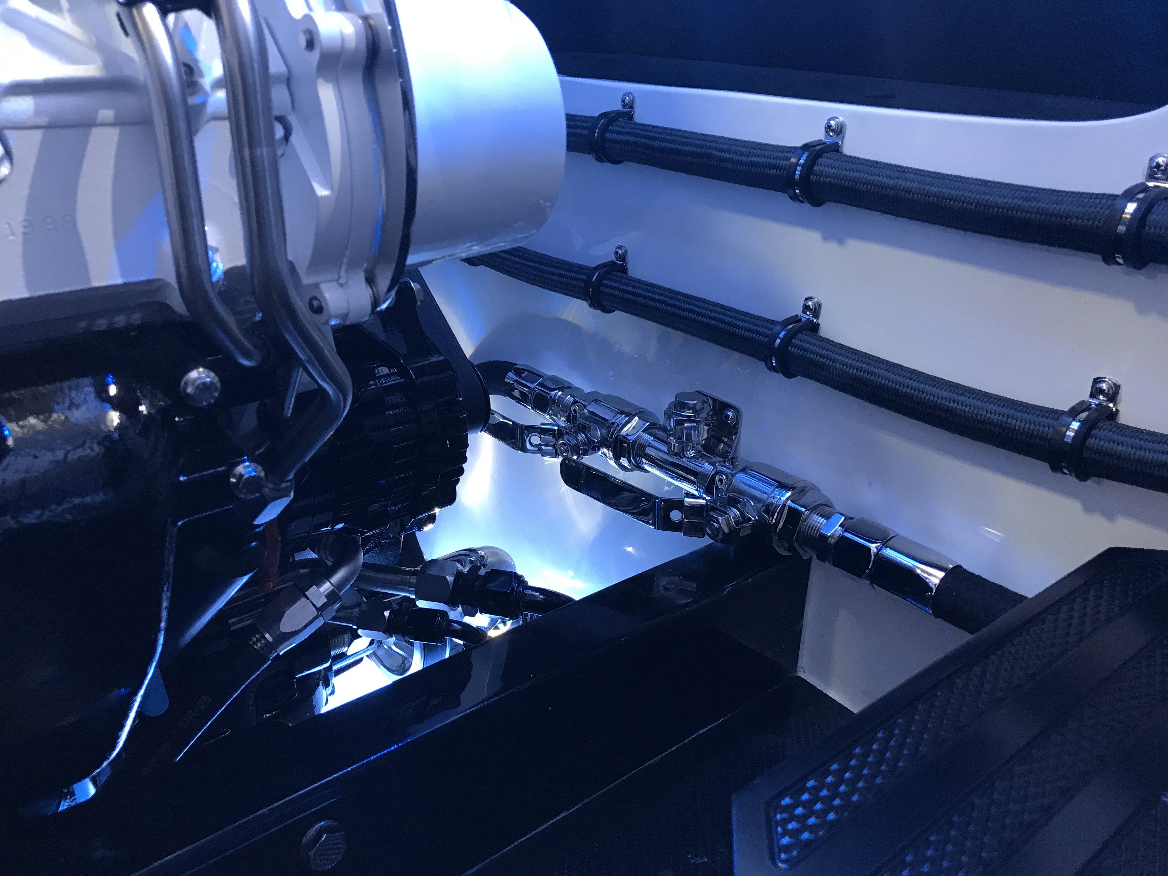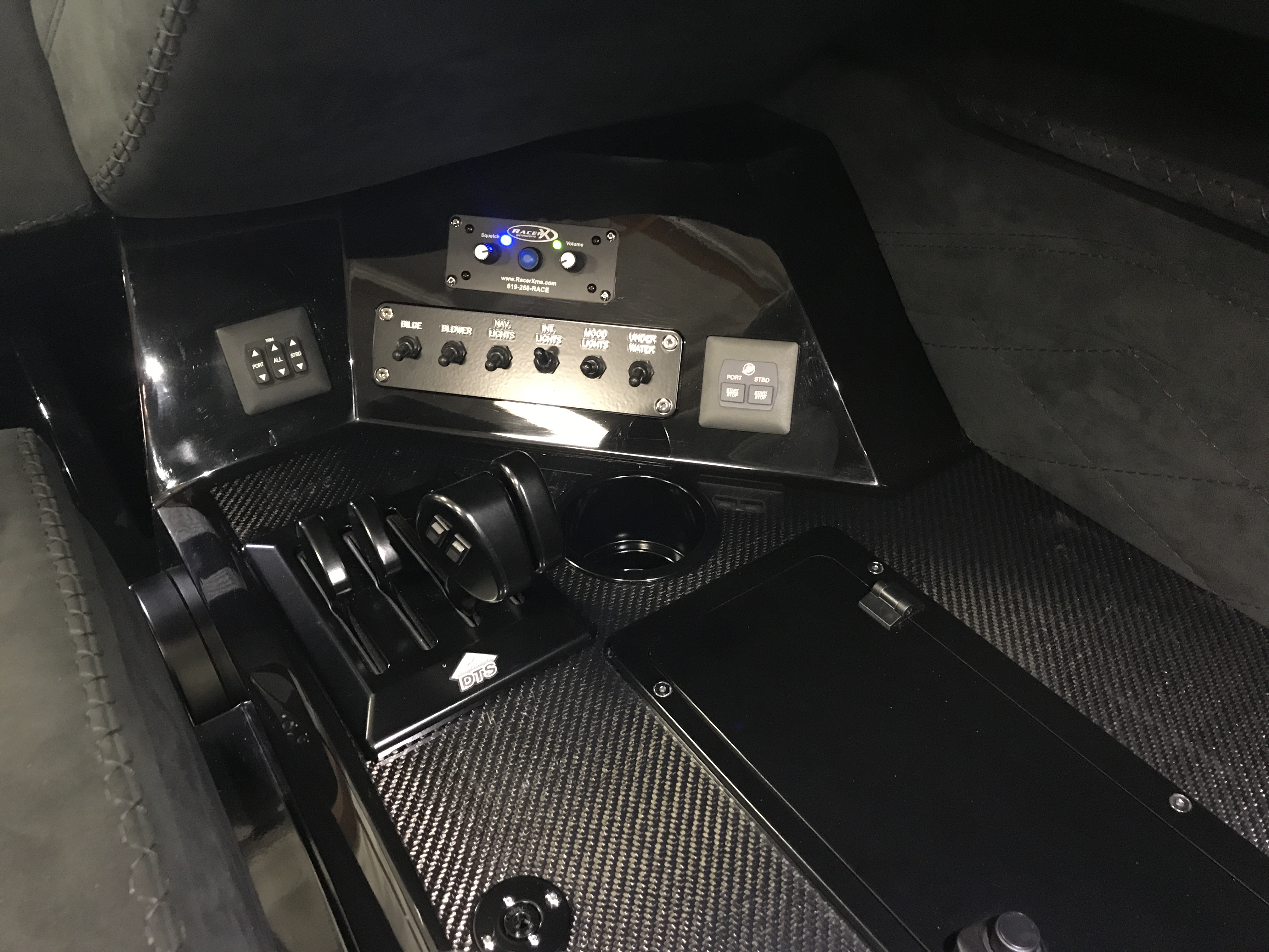 The 4th hull in the M44 series also sports Two Simrad NSS12 Evo3 touch screen monitors, one Garmin 7612 GPS plotter, and a Garmin VIRB camera system with a billet bracket on windshield mount. Complimenting the sophisticated array of technology on board the craft are also such additions as a Rigid LED lighting package, a Stage III stereo, and an extremely impressive 6-person intercom system with boat-to-boat VHF.