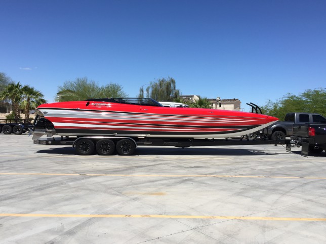 A poker run is not a race… but if you’re one of the fastest boats out there are you really going to let someone fly past you as you putter along? We didn’t think so! And neither did the crew of DCB’s newest craft that was delivered to the lucky owner the same weekend. DCB’s latest craft, a red and white M35 Widebody with 1350’s was the second boat down to the first card stop, running a whopping 176mph at 6350rpm. That’s fast!