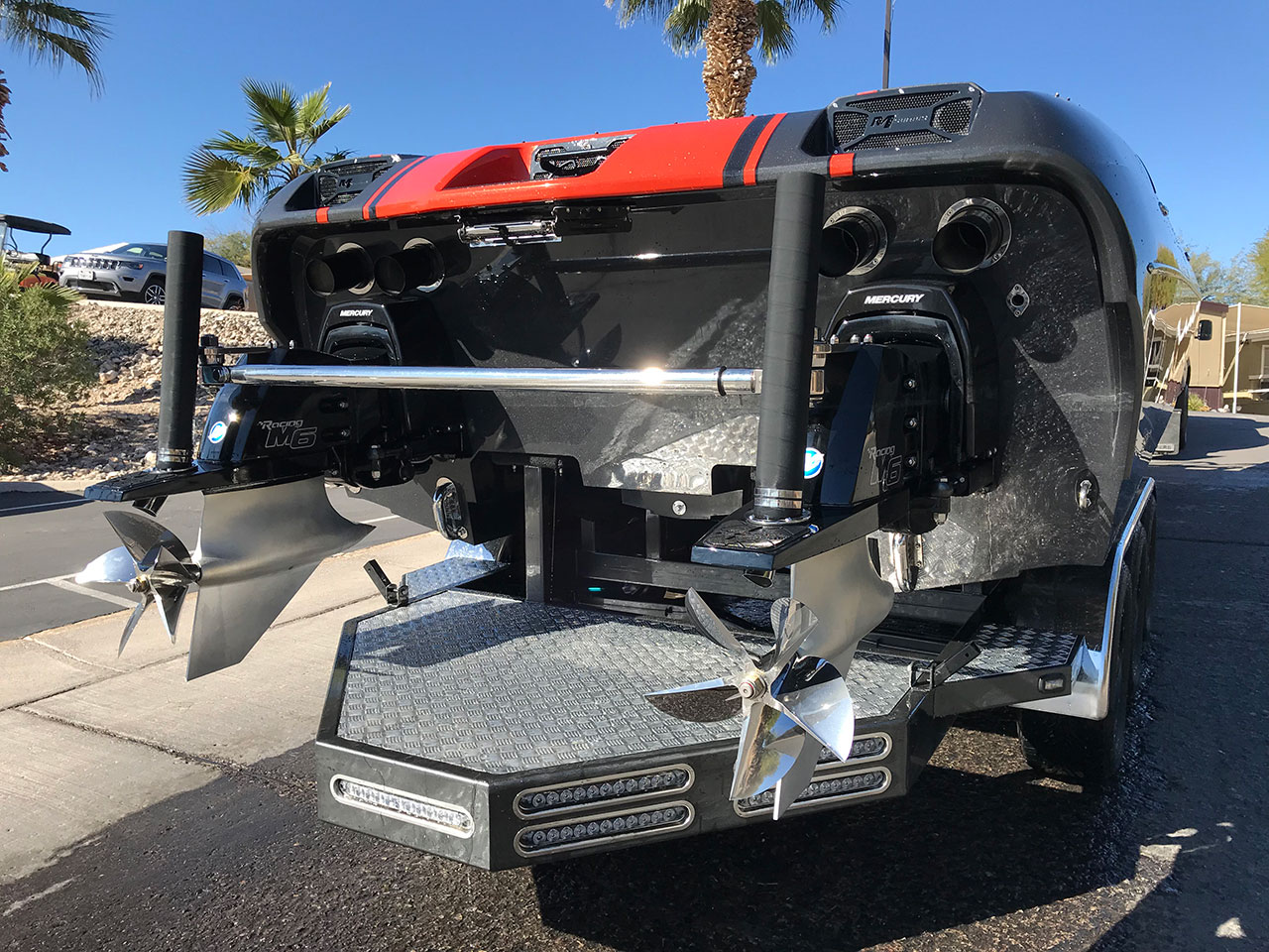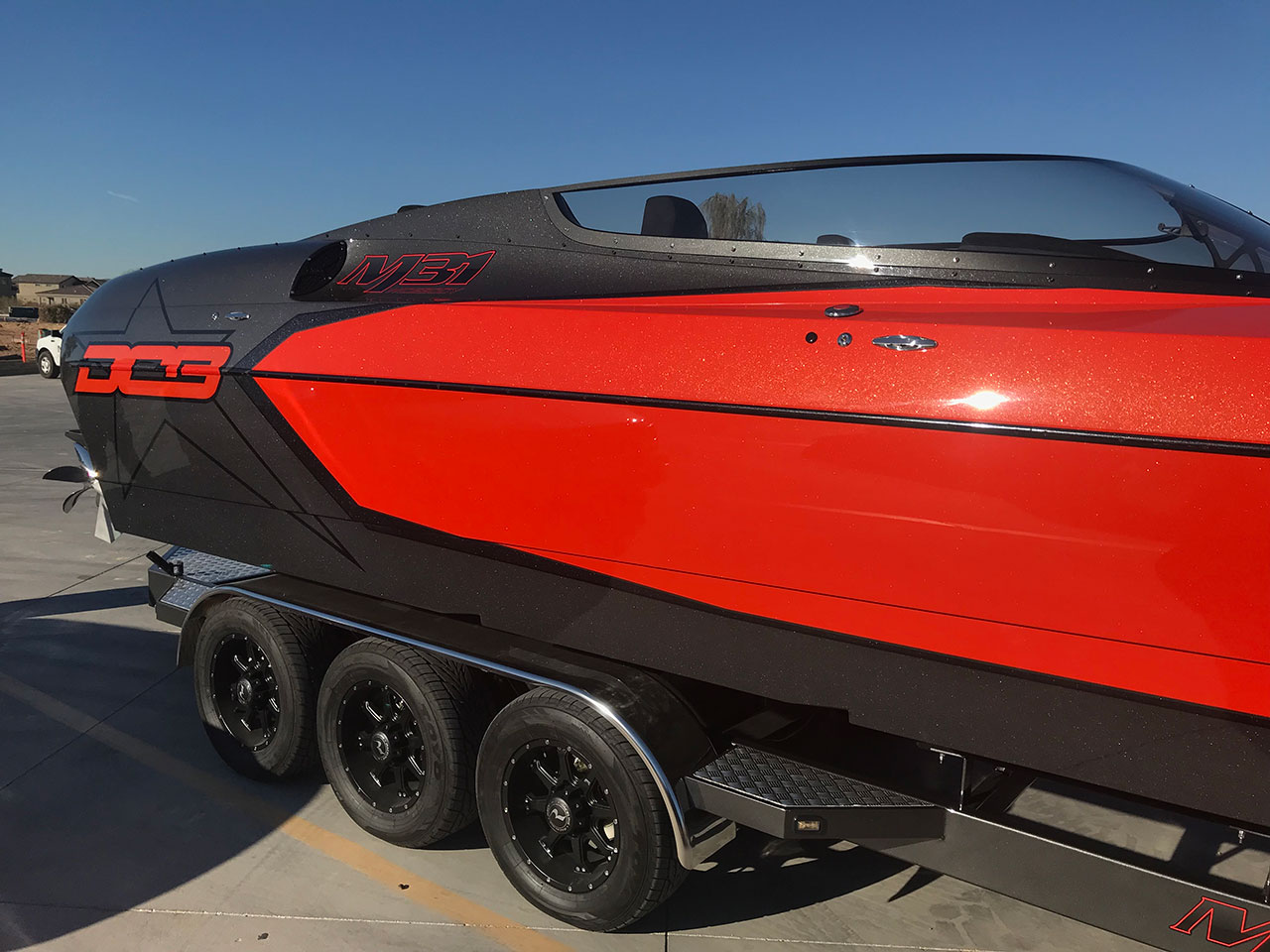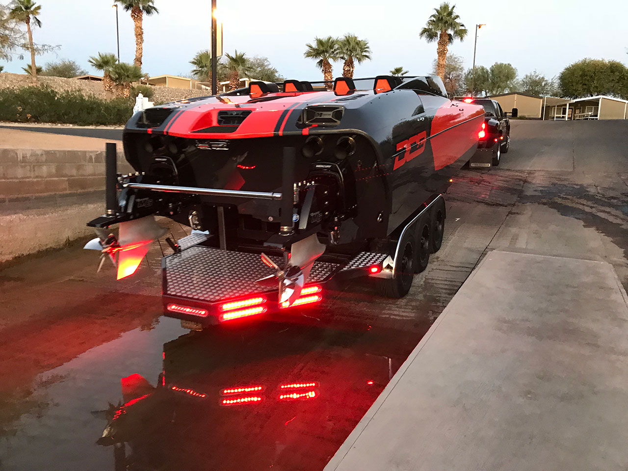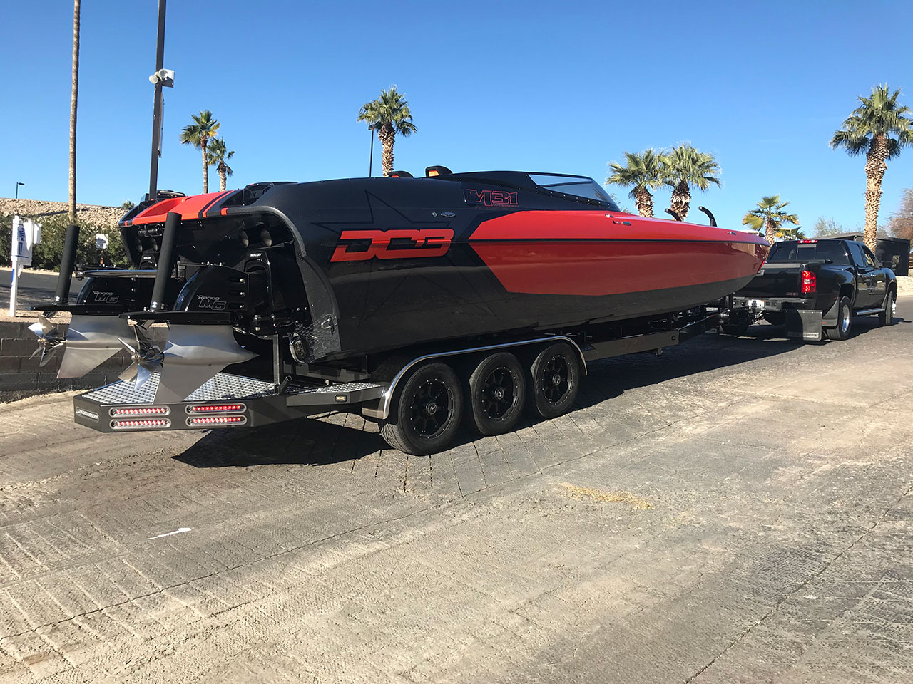 · Extreme Custom Trailer, triple-axle with customized 18” rims, SS fenders and triangular drive guard.