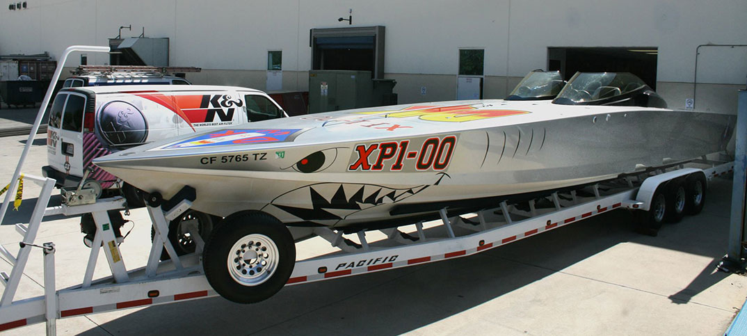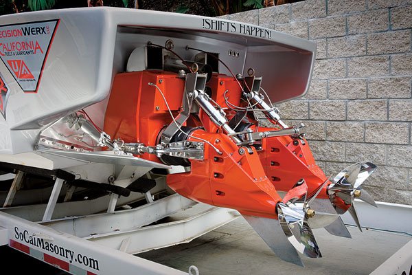 We’ve covered plenty of customized rigs in the past but this one is particularly notable. Costa Mesa’s Dave Kutscher and Pat Weismann of Traction Products Inc./Weismann Marine LLC have brought their marine expertise and passion for performance boats out to the party and it wouldn’t be surprising if they were the life of it; these guys know their way around the racing circuit and engineering for the win. When talking about their new boat, they emphasized that they “…are not allowed to race this package in the top classes. Our semi-automatic transmissions were banned in 1997, after we went 11 for 11, winning the class 1 title in APBA and SBI. Our drives were banned in 2001. We race the boat in the Performance class which is just a MPH restriction.”