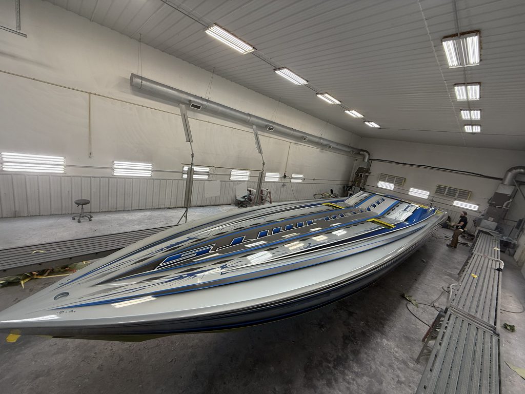 Though Stephen Miles Design has painted high-performance powerboats from the likes of DCB, Fountain, Mystic, Nor-Tech, Phantom, Velocity and more, the Owensboro, Ky., outfit made its reputation dressing V-bottoms and catamarans from Outerlimits. In fact, Miles currently has two completed SL 50 V-bottoms from the Bristol, R.I., company ready to deliver at the shop.