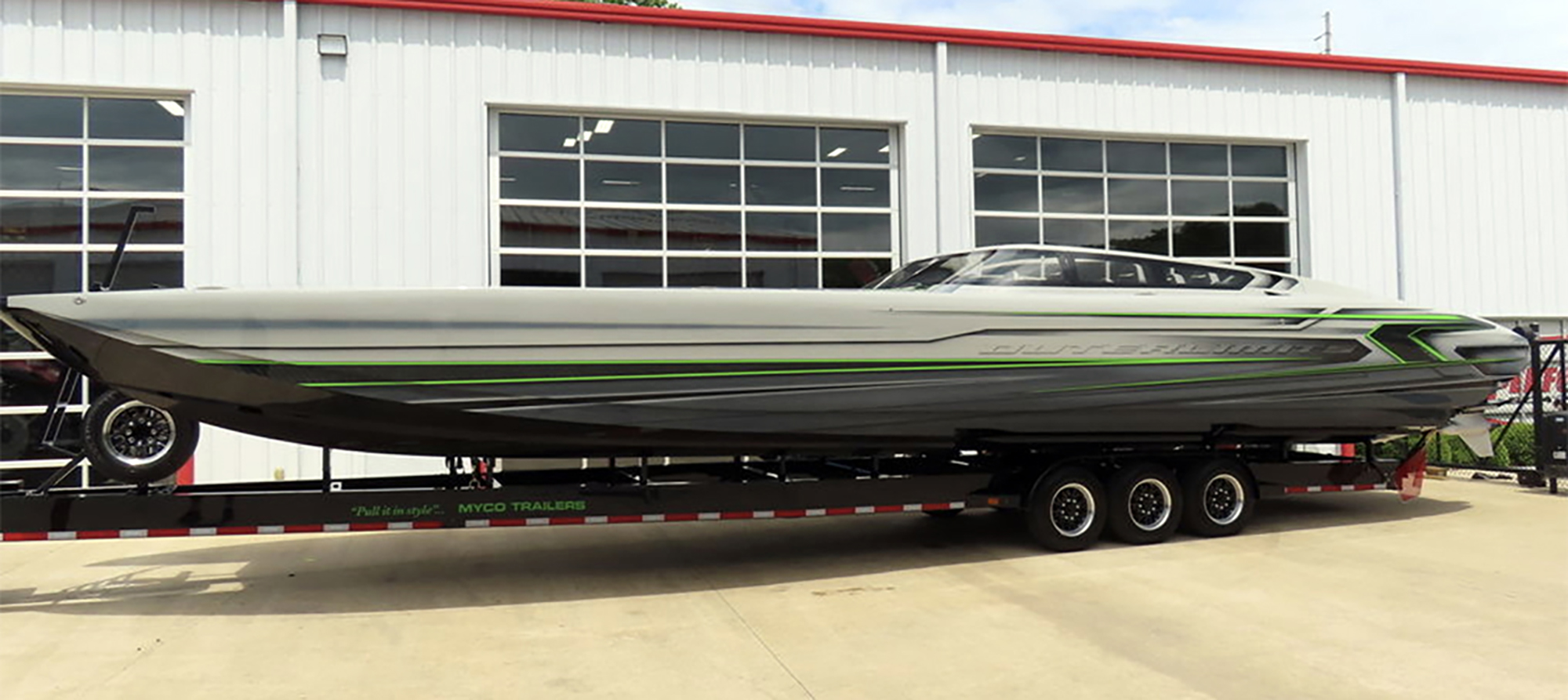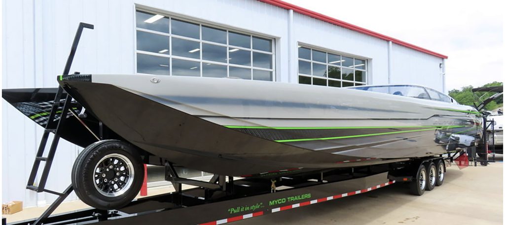 Price is $1,495,950. A triple-axle aluminum MYCO trailer, a cockpit cover and a travel cover are included.
