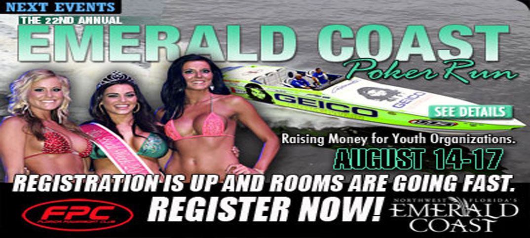 THE EMERALD COAST POKER RUN IS ONLY THREE WEEKS AWAY! The 22nd Annual Emerald Coast Poker Run is shaping up to be a great event. Stu Jones from the Florida Powerboat Club reports early registration is up and the Emerald Grande is sold out. The better news is many rooms are still available at alternate locations and they have a new property onboard with great rooms rates and docks on property.