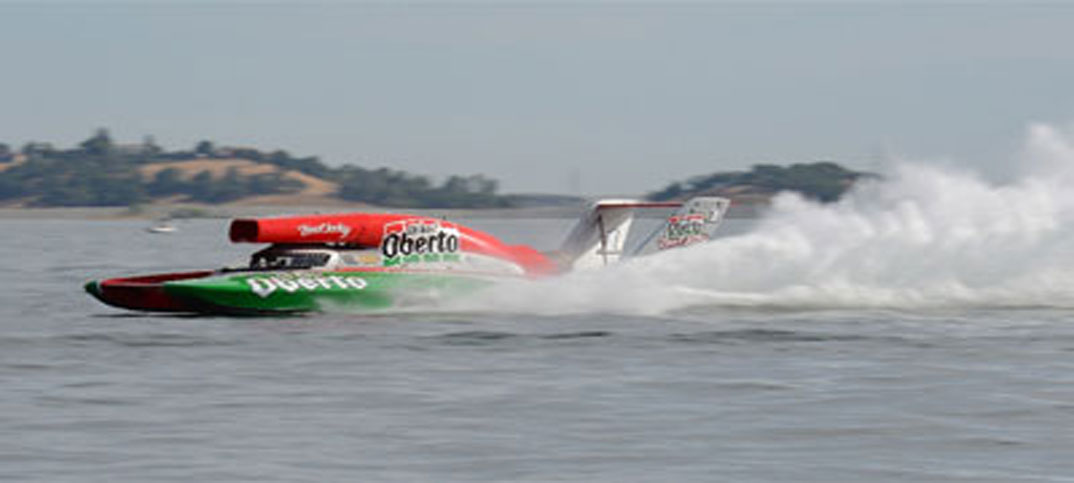 When Steve David was forced to start the Championship Final Heat of BigWake Weekend on Sacramento’s Folsom Lake in lane four, it looked like the Lighthouse Point, Florida driver would have his work cut out for him. Steve David accelerated to the start line, timing his run perfectly, and had established a lead by the time the fast final heat field got into the first turn. The remainder of the five lap final on the two mile course was all Steve David and the 1 Oh Boy! Oberto. Challenger Jimmy Shane in the 5 Graham Trucking had won all three of his prelims and started the heat two lanes to David’s left, appearing to have an advantage. But the superior speed of the top qualifier and defending H1 Unlimited Series High Point Champion was too much for Shane and the rest of the field to handle. Shane finished second with J. Michael Kelly in the 37 Performance Chevrolet rounding out the top three podium finishers.