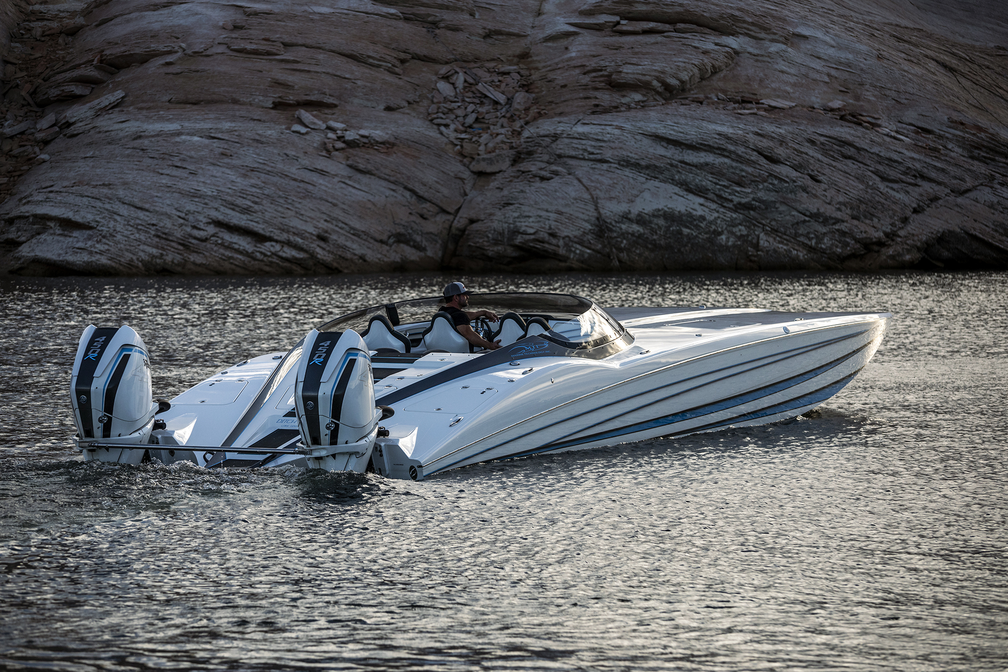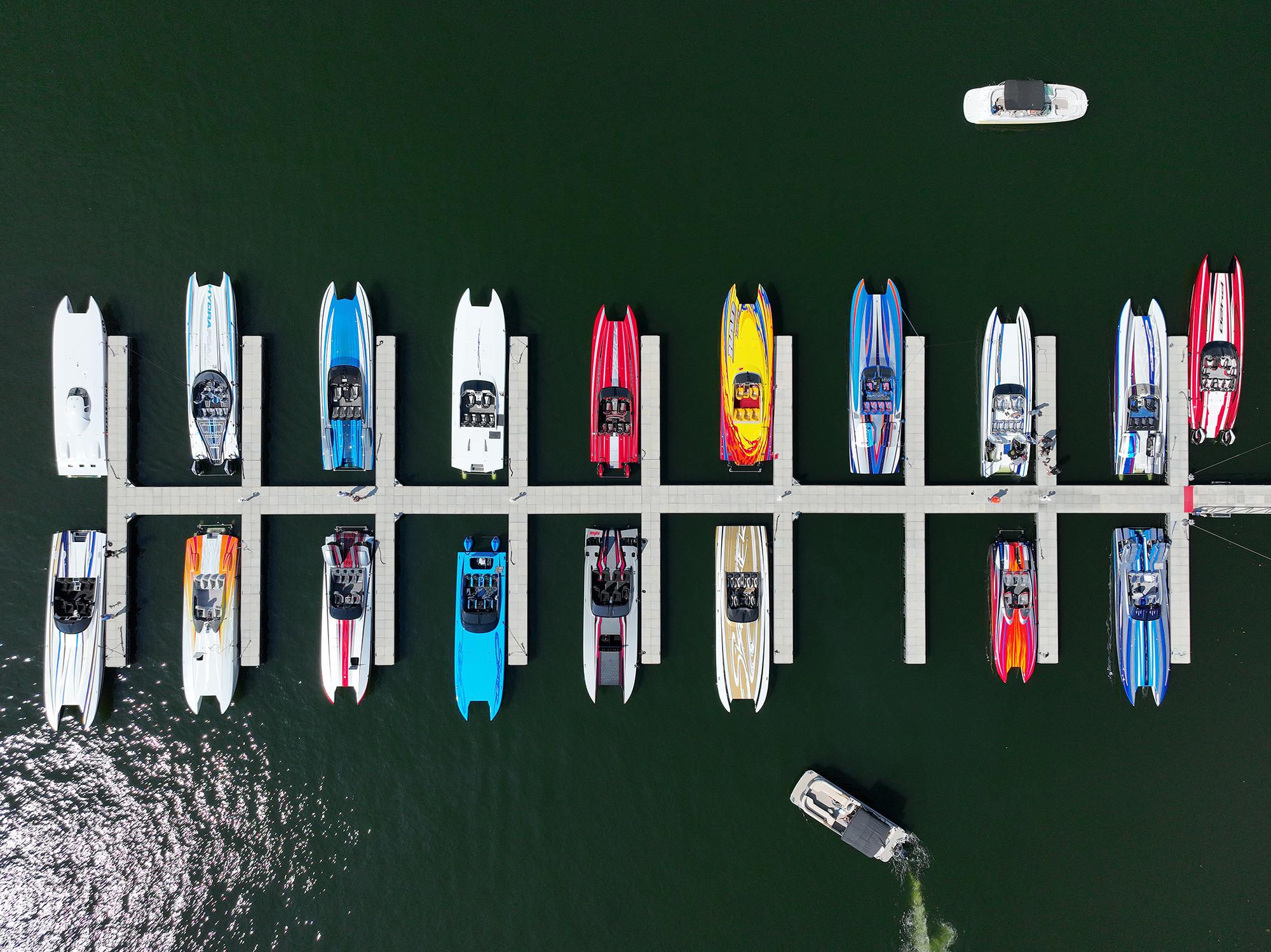 For ferocious brand-passion and an extended family reunion, the vibe at Weekend At Ronnie’s—powerboat collector Ron Szolack’s annual invitational gathering at the Lake of the Ozarks in Central Missouri—could not have been hotter. In addition to the 30 Skater catamaran owners and their guests who showed at the event, there was a 44-foot MTI catamaran and Performance Powerboats P420 catamaran in the mix. Disgruntled Skater purists may scoff. Then again, life is too short to exclude dear friends for the sake of exclusivity.