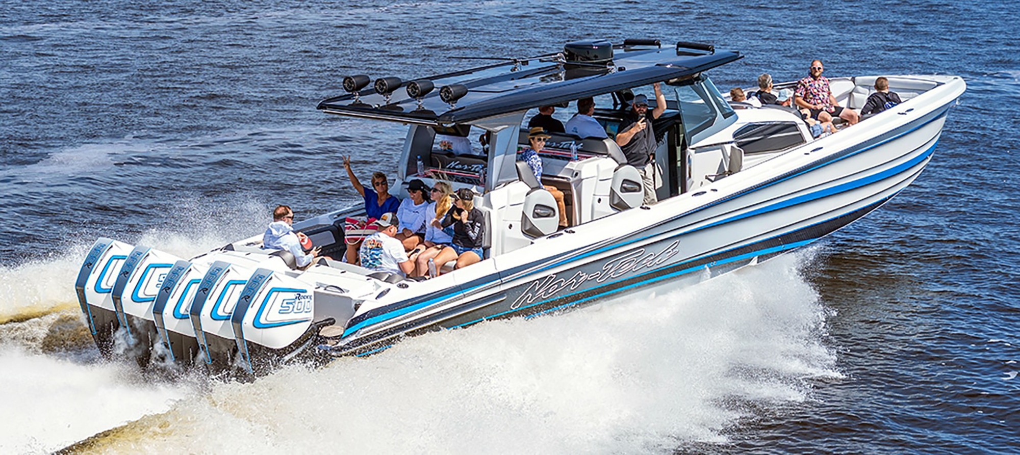 Below that you’ll find DIRTy Money, a Nor-Tech 500 Sport center console Morris painted for new clients Jesse and Stephanie Neumann of Minnesota. The 50-footer—the Neumann’s second—Is named for the couple’s earth moving and excavation business.