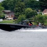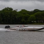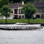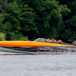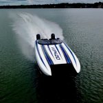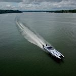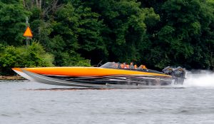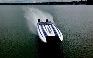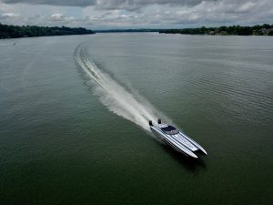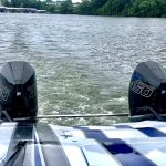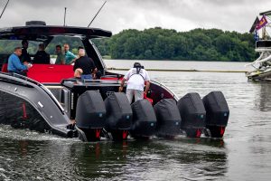 Of the two Marine Technology Inc. (MTI) hulls equipped with the 450 engines, one is Mercury Racing’s privately owned 340X tester (which took two of the outboards), while the other, a quad-powered 42′ MTI-V, is a factory demo boat. Tim Gallagher, Sales and Marketing Manager of the Wentzville, MO-based builder, was at the Nashville event and couldn’t have been more pleased by the boats’ performance.