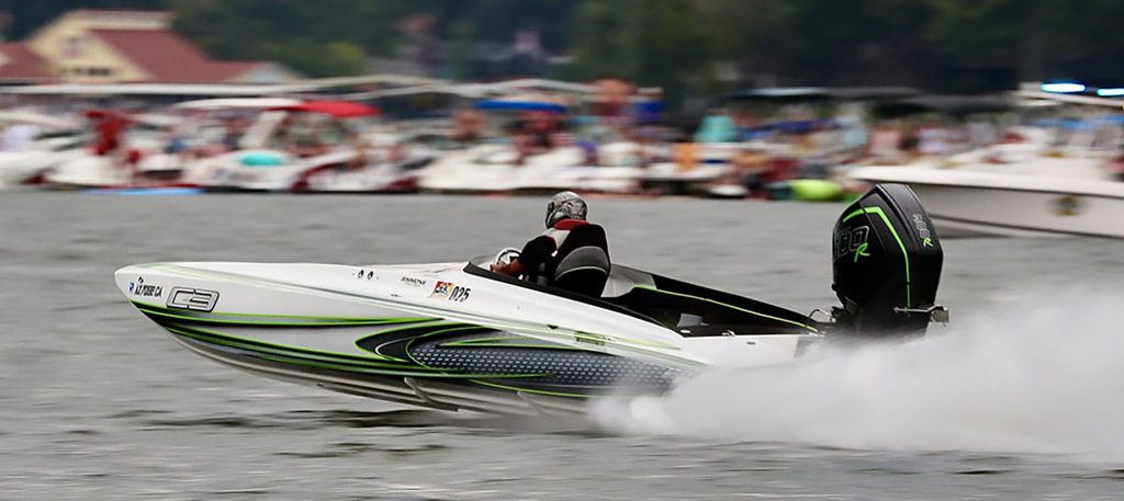 Despite rain during his second pass at the 2020 Lake of the Ozarks Shootout, Caparell reached his goal of running 100 mph in his single-outboard-powered 24-footer. Photo by Pete Boden/Shoot 2 Thrill Pix.