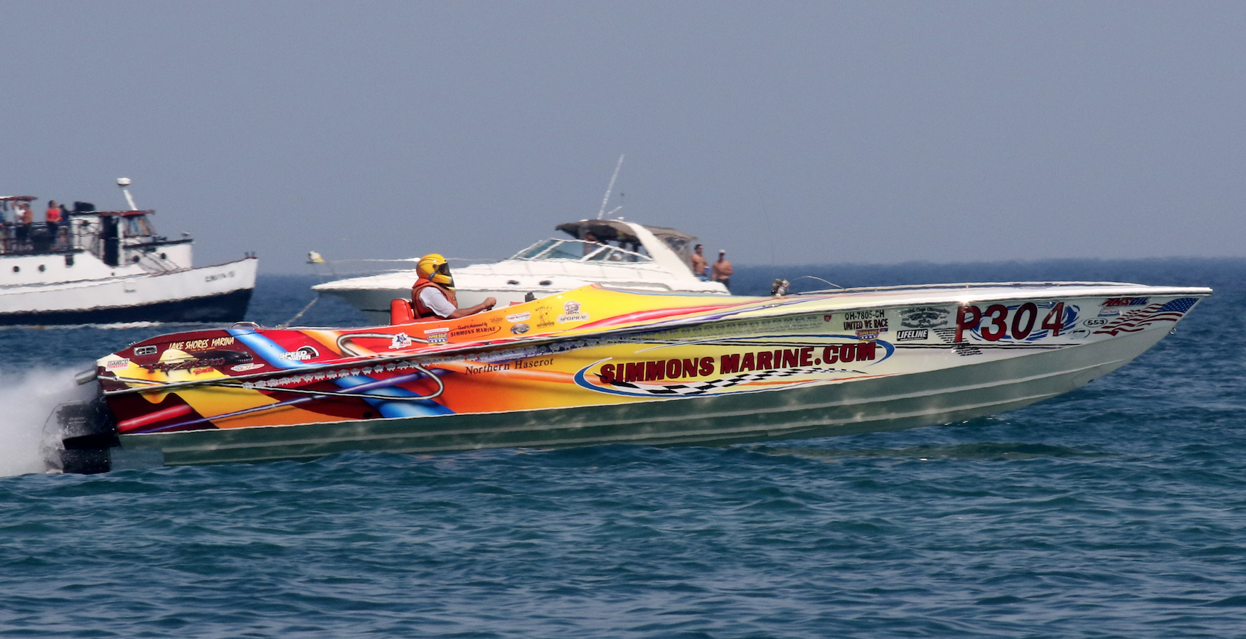 In Production 3 class, Wix Filters took an early lead and dominated the class for most of the race (as they did on Wednesday for the win), but ultimately, SimmonsMarine.com overtook them and grabbed the lead and the checkered flag. Wix Filters had to settle for second, with Thee Dollhouse in third. GetRubberMulch.com did not start. SimmonsMarine.com, a 34′ Phantom, is owned and driven by Jim Simmons, with Tony Canale on throttles.