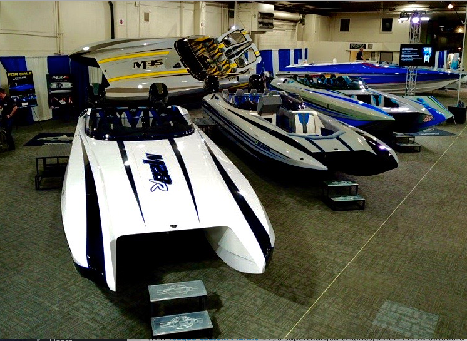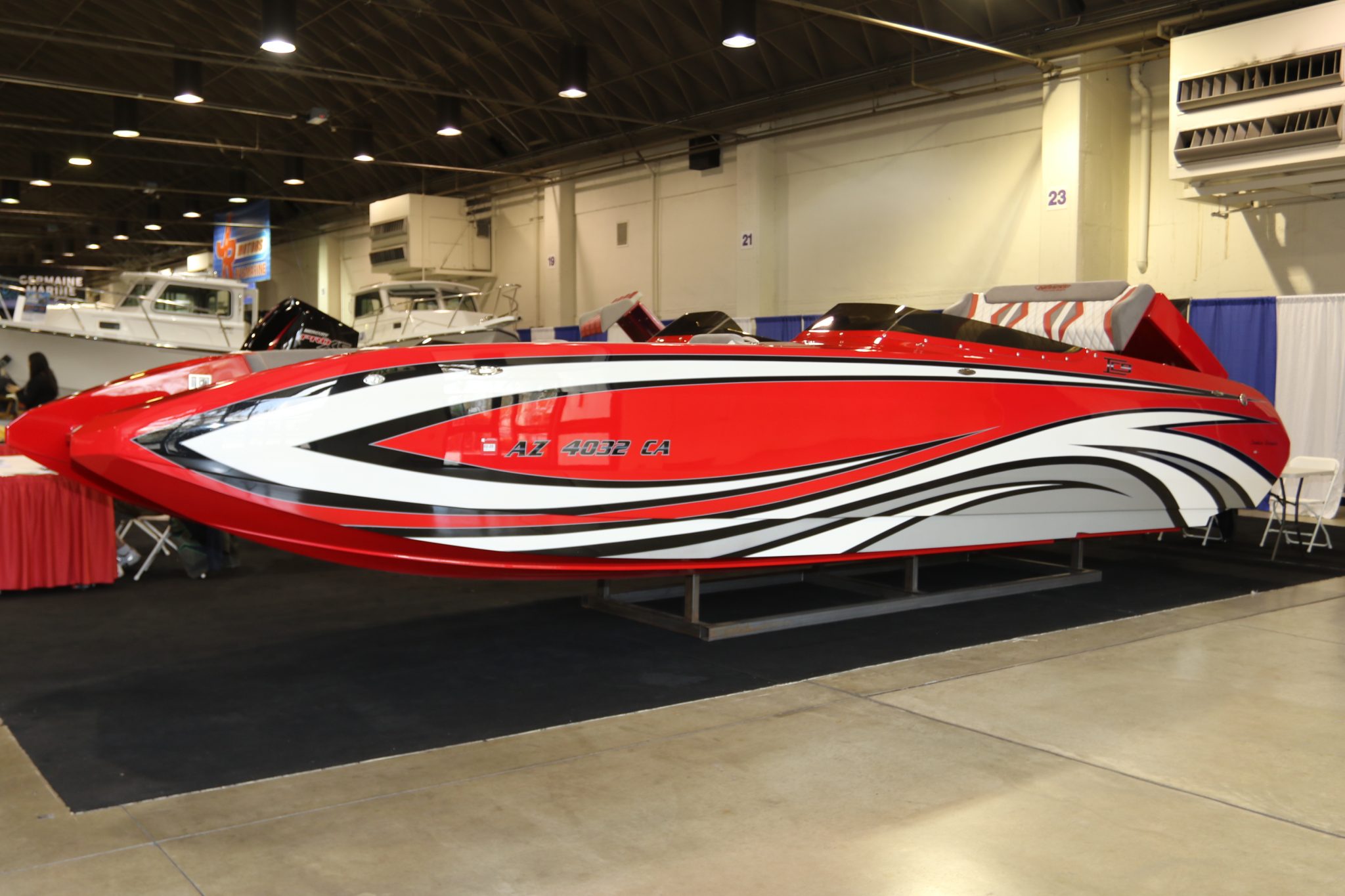 Nordic Boats and Hallett Boats of Lake Havasu City, AZ moved in to their usual massive square footage space to accommodate all of their eight various boats. Debuting yesterday was the all-new Nordic 48′ Vee bottom and the 31′ flat deck catamaran with a pair of Mercury Racing 400Rs. Company General Manager Thane Tiemer reports that the company had a record-setting day yesterday, with the most number of deposits taken for new boat sales.