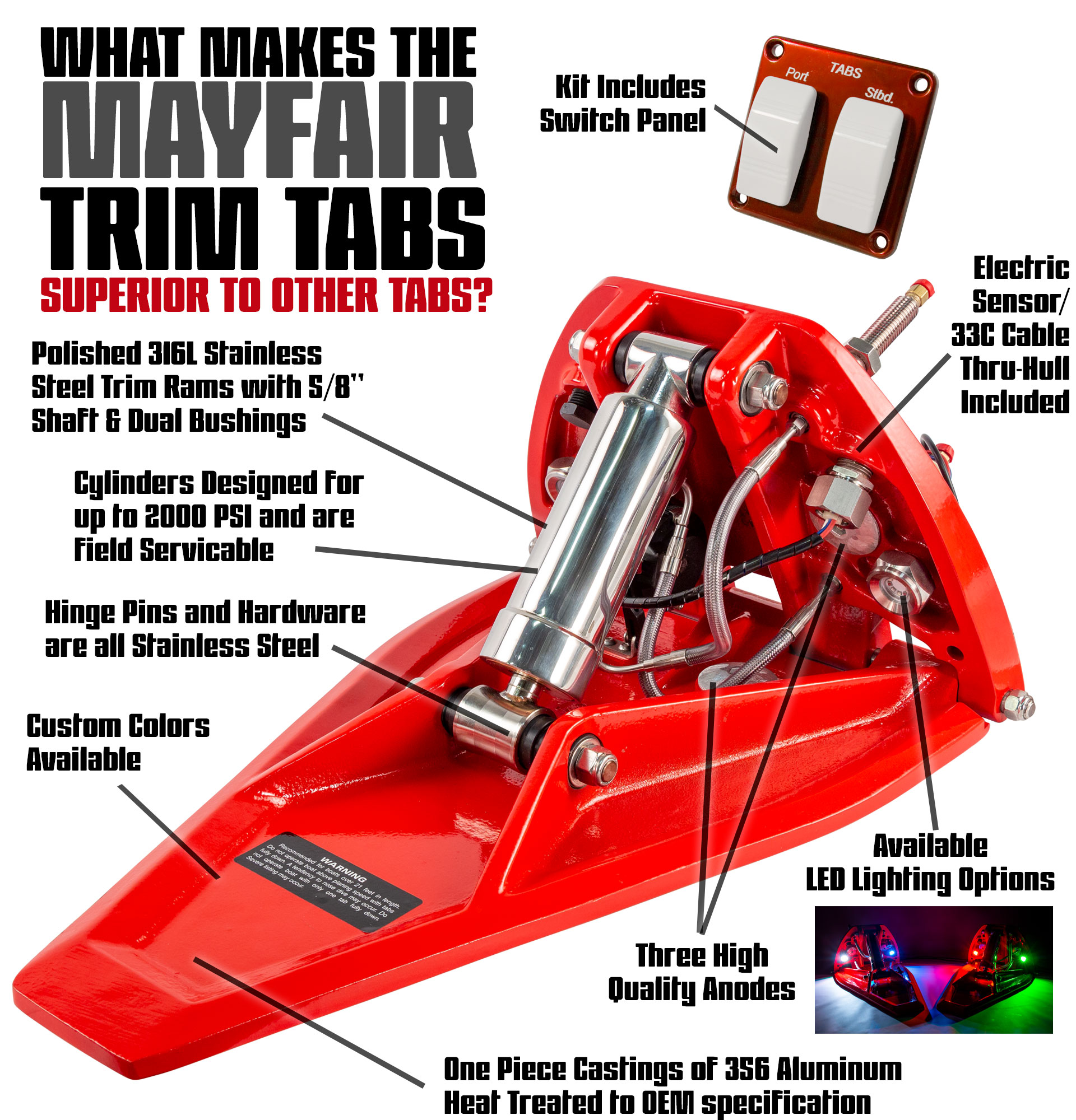 From the moment you unbox them, it’s clear that Mayfair Hydraulics After-Plane Trim Tabs are a cut above the rest. They are manufactured from premium quality, high-strength 535 Aluminum Magnesium alloy castings with deep-ribbed cross sections for enhanced strength and stress distribution. The use of 316 stainless steel hardware and powder-coated components ensures increased corrosion resistance, making these trim tabs a reliable choice for any marine environment.