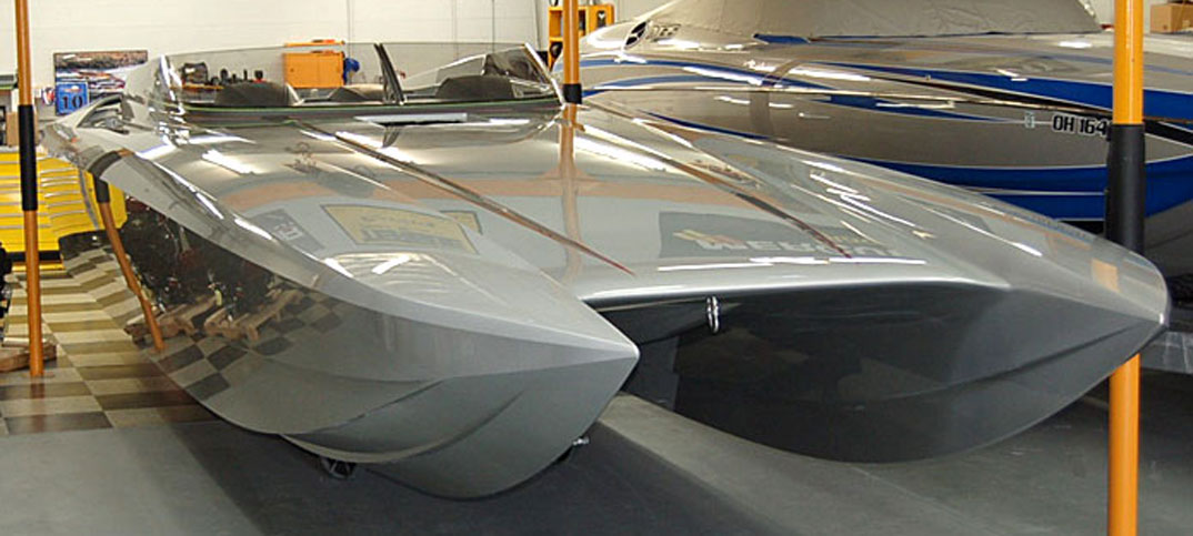 The M41 has an LOA of 41′ 1″, the 10’10” beam, and 66 inch wide tunnel is deeper than the other two M boats and has wider sponsons. The front wing extension will provide greater compression and the boat will offer some cabin configuration options for customer preferences. I expect the M41 to run hard in water that some traditionalists would believe it can’t run in. I also believe the boat will produce great numbers with the installed Mercury Racing 1350’s Turbo Charged Engines and M8 drives.