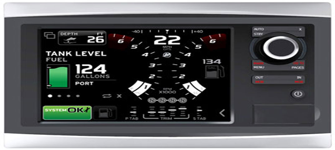 The VesselView 7 features a 6.4-inch glass touch screen, the unit displays more than 30 engine parameters, including fuel level and range, oil temperature and pressure, battery voltage, water depth, generator monitoring, HVAC and more. The ECO mode tells operators what trim and rpm settings will give them the best fuel economy. This feature won a “Green Product of the Year” by West Marine in 2010 and can provide up to 20 percent better fuel economy. The diagnostic scans are also performed when the engines are running and gives the operator all needed information and alarms. The technology is also adaptive, so it will remember user options and provide the information most often or repeatedly used.