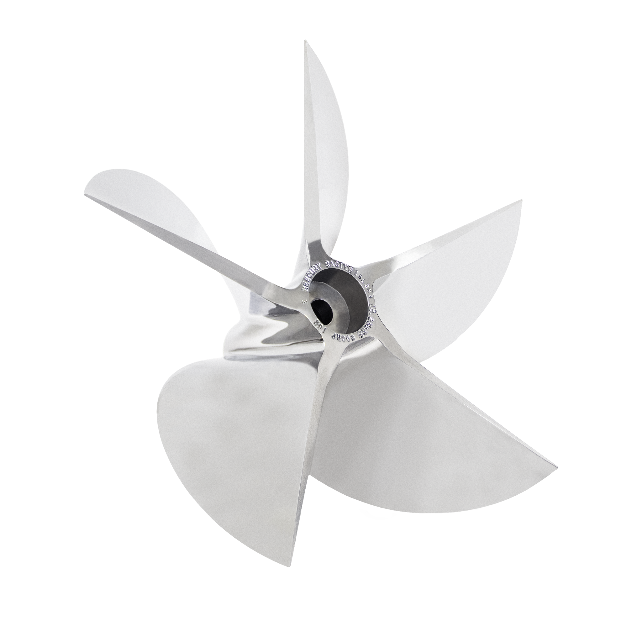 • 600HP-Rated 5-Blade CNC Cleaver—A surface- piercing design engineered with the optimal blade thickness to deliver unmatched top-end speed and handling on performance hulls powered by Mercury Racing 520, 525, 540, 565 and 600 SCi engines paired with a Mercury Racing Bravo XR Sport or Sport Master outdrive. Prop slip is dramatically reduced to an average of 4.5 percent at WOT in Bravo XR Sport and Sport Master applications. The cleaver is produced to exact tolerances on the same state-of-the-art CNC milling machines used to create the benchmark Mercury Racing CNC Cleaver propellers for use with Mercury Racing M6 and M8 outdrives.