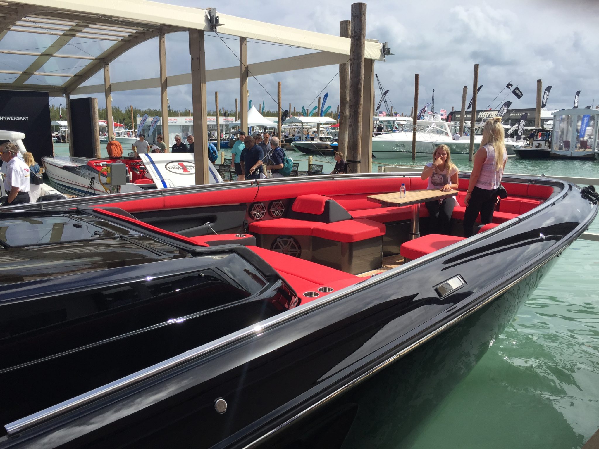 While it’s not exactly the fastest boat on the water, another exciting debut was Cigarette’s gorgeous (and gigantic) 59-foot Tirranna, a boat so big that it requires six Mercury Racing 400Rs to reach a top speed of 72 mph. A black hull with a bright red interior, this luxury sport yacht seemed to go on for miles, making it virtually impossible to photograph in its entirety. It’s a very roomy and immaculately crafted piece that company president Skip Braver said was two years in development and was an entirely new concept in boating. “It’s not a yacht, and it’s not a center console,” he told Powerboat Nation. “It’s a Tirranna.”