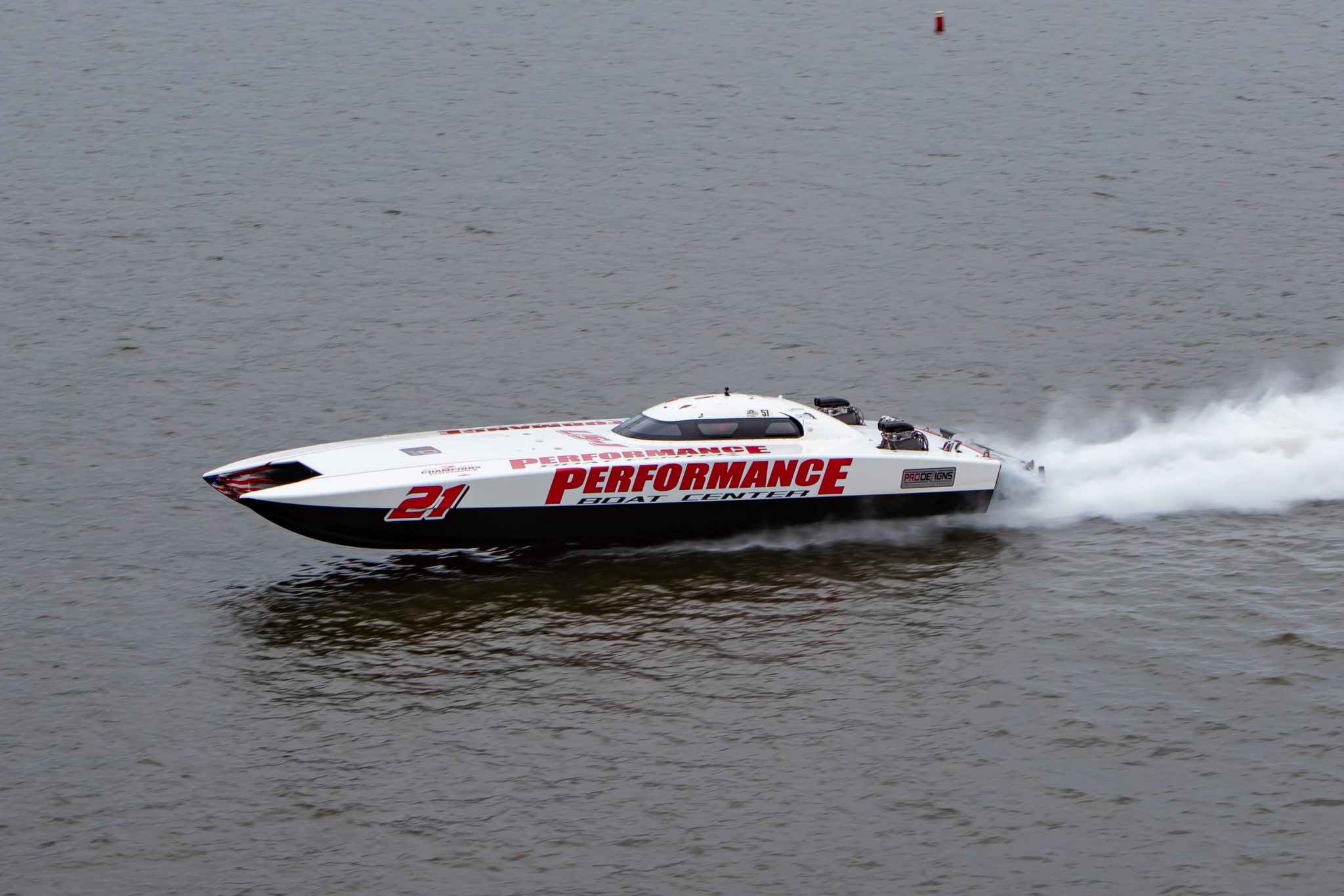 The 2016 Skater 388 canopied four-seater raceboat, formerly campaigned as Performance Boat Center/Jimmy Johns, was World Champion in 2016 and 2017 and National Champion in 2016, 2017, and 2018. One of the most competitive Super Cat race boats ever built, the boat was raced by Coil on the wheel, with John Tomlinson on throttles. It was sold to super-enthusiast Ron Szolack, who had the crew at Performance Boat Center install 557-inch dual-fuel PSI supercharged Sterling engines that can run on either 110 octane or on E90 (the latter of which can deliver 1,700+hp at 7,200 rpm).