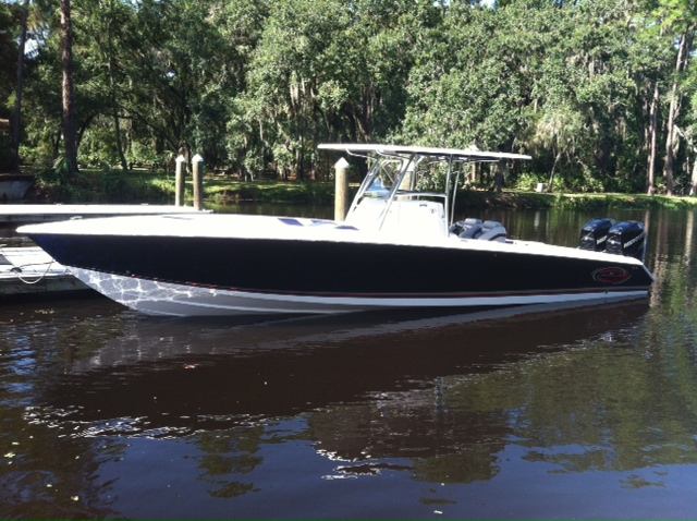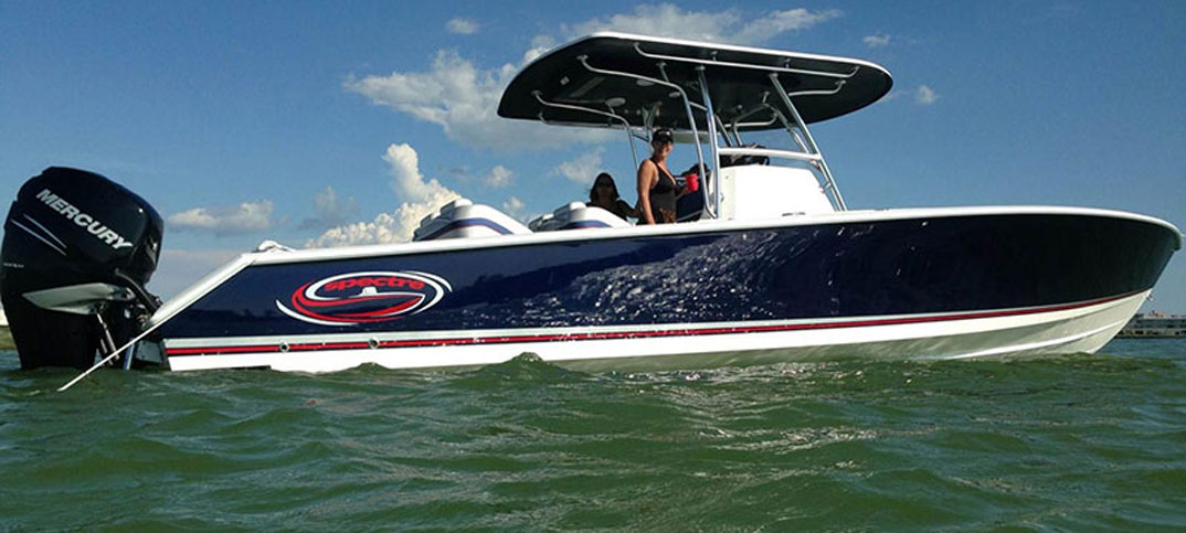 At the Clearwater Race we got a chance to talk to Jay Pilini and poke around his new 35 Spectre CC. Jay is back to building Spectre’s and right now he is hot on his new 35 Center Console. Measuring 34.8 feet long and with a 9.9 ft. beam the boat is perfectly set to fulfill a void in the market. This boat will run with many other boats costing much more money.