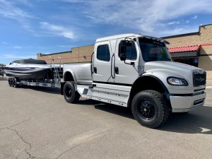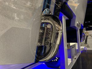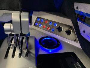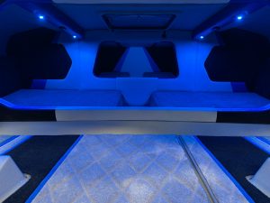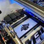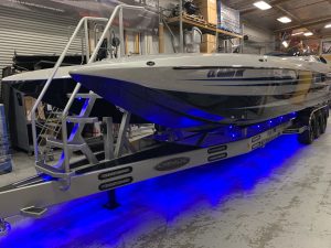 Another impressive part of the package is the custom triple-axle trailer that Douglas had built by Adrenaline Trailers (Lake Havasu City, AZ), with sports customized 20” American Force rims, stainless-steel fenders, triangular drive guard and a truly dazzling undercarriage LED lighting package. (See photos below.)