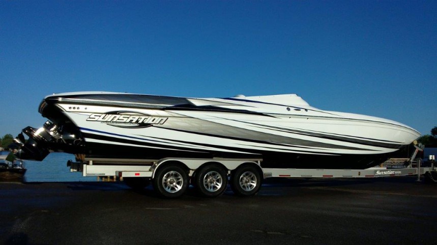 This great looking brand new boat with Mercury Racing 565’s was delivered right on time for the Memorial Day weekend. Performance Boat Center Owner Brett Manire said this after running the boat all over Lake of the Ozarks. “The 36 Sunsation impressed past expectations. The fit and finish are top notch, the paint turned out great, the custom trailer matched the graphics perfectly.” He went on to say “The boat handled the rough Holiday waters of the Lake of the Ozarks better than any other boat of that size I have driven. The boat was delivered on time as promised and all of us at Team Performance Boat Center are impressed.”