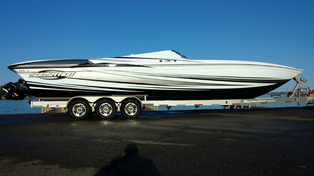The full details of this 2016 Sunsation 36 SSR:  Powered by Staggered Mercury Racing HP565EFI, ITS transoms, Bravo 1XR sterndrives with Maximus 5 blade props, 380 Kplanes, Big Gun 5” exhaust tips, Mitcher T custom paint, acrylic Sunsation oval see through engine hatch, Mcleod electric bolsters, Livorsi DTS controls, Livorsi gauges & depth sounder, Smartcraft Vessel view 4, Garmin 741xs touchscreen GPS Chartplotter, Livorsi LED tab indicators, carbon fiber dash panels, Fusion Marine stereo system, Sport cabin option, pump-out porta-potty, removable cabin & cockpit carpeting, cockpit cover, and Heritage custom triple axle trailer with spare. All trades considered, financing and transportation available.