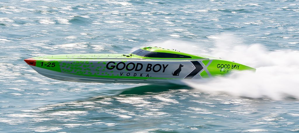 Owner/throttleman Rob Lockyer and driver Alex Pratt piloted their 52-foot Outerlimits to victory. Photos by Ashton Coker/Good Boy Vodka.