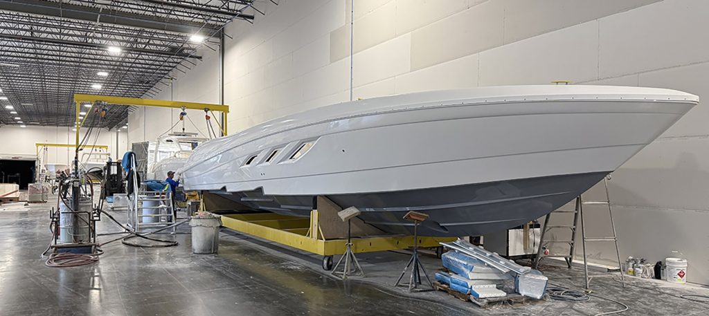 Painted by Stephen Miles, the first Platinum Powerboats 428 catamaran is heading to rigging and—if all goes to schedule—be on the water for its first test session this week.