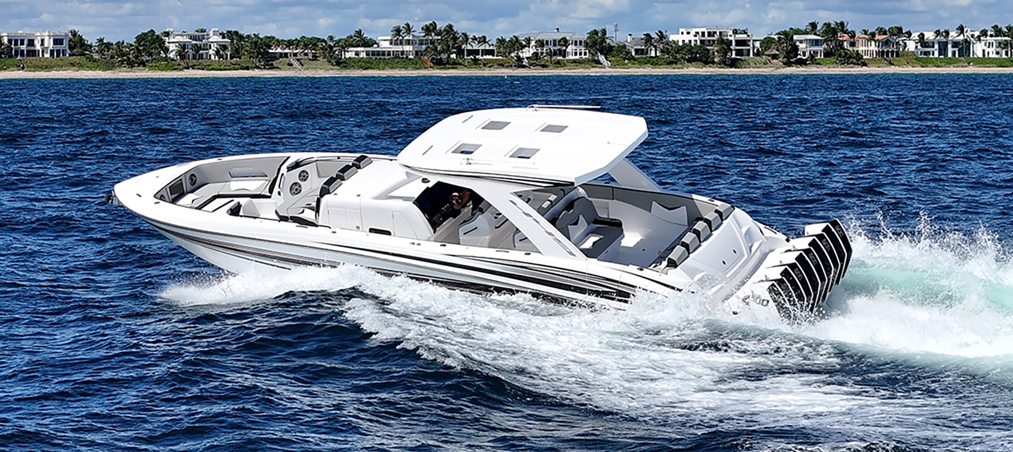 Though the Deep Impact 449 center console on display in Fort Lauderdale this week has five Mercury Racing 500R powerplants on its transom, the new model is the only center console in its class that can handle six outboard outboards.