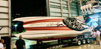 In addition to getting boats ready for the Miami show, Manire and his crew will be flying to MTI’s manufacturing facility next week to check on the progress of their new canopied race boat that will be campaigned by John Tomlinson and Myrick Coil later this year on the offshore race circuit. Meanwhile, PBC has been contracted by speedboat enthusiast Ron Szolack to retrofit its previous raceboat, the World Champion 388 Skater, with 2,200-hp PSI engines for its new owners.