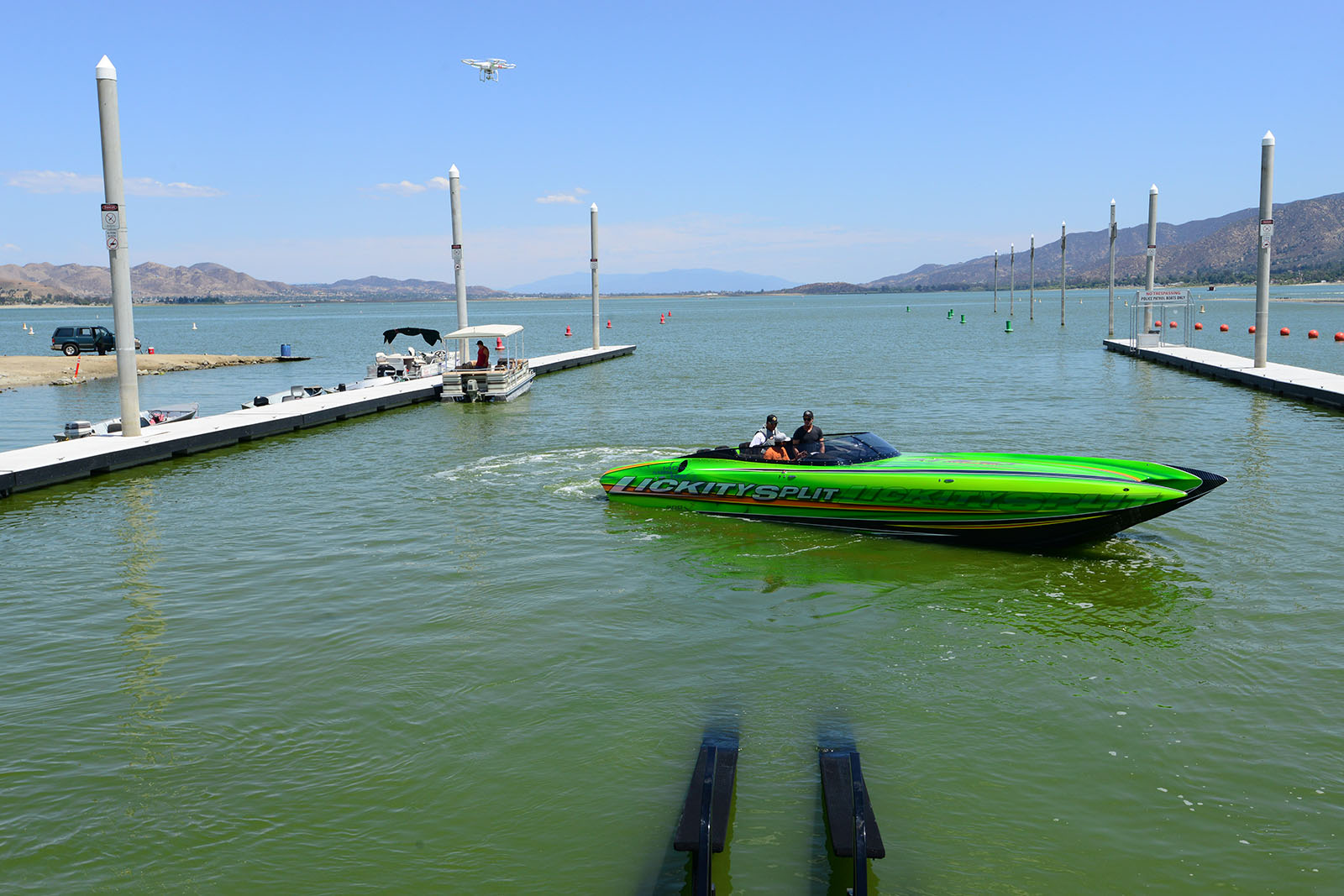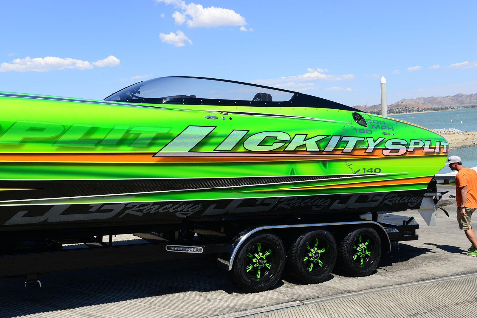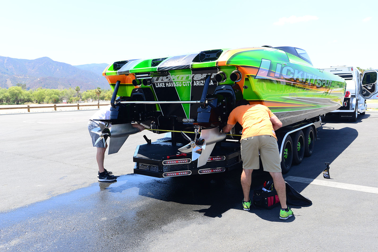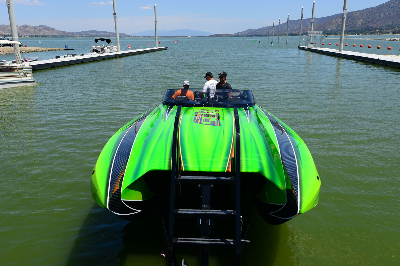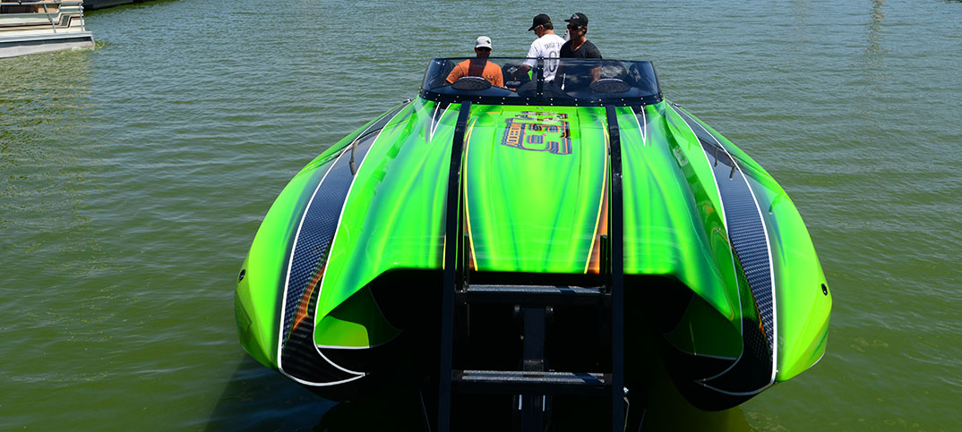 Jeff at DCB let us know today that the M35 “Lickity Split” took to the water for initial testing before being delivered to the customer. Jeff’s summary of the outing was upbeat: “Tony and Dave ran it up to 165mph @ 6500rpms (on limiters) with a 39” propeller at Lake Elsinor during the initial water test and shakedown. Everything ran great, and we hope to get the larger 41” propellers before the formal delivery to the customer next week at Lake Havasu.” We at PBN look forward to seeing this awesome DCB at many poker runs in the future.